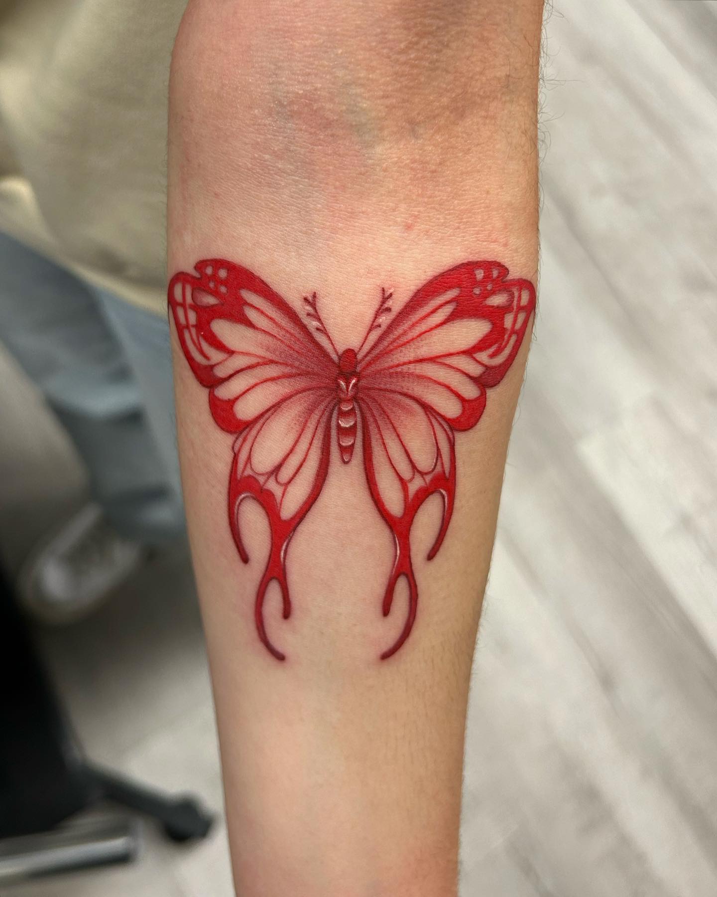 The vibrant red butterfly tattoo features intricate wing patterns that create a striking visual effect.