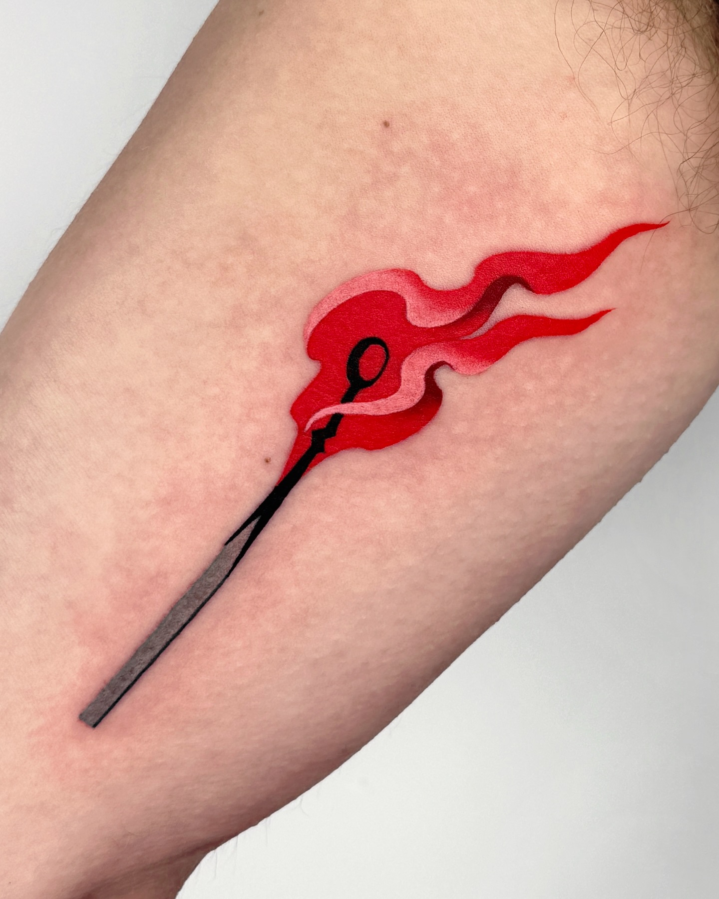 The tattoo features bold red flames swirling around a pair of black scissors, creating a dynamic and eye-catching effect.
