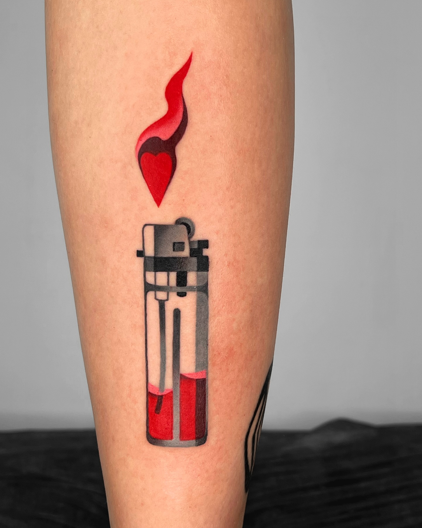 The tattoo features a lighter with a unique flame shaped like a heart.