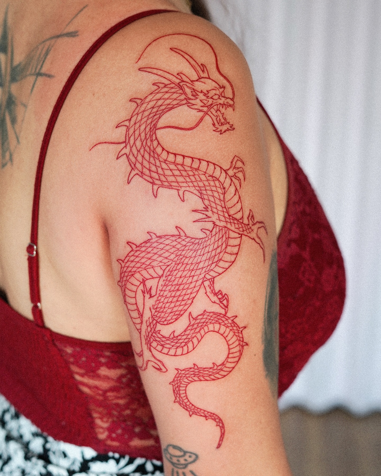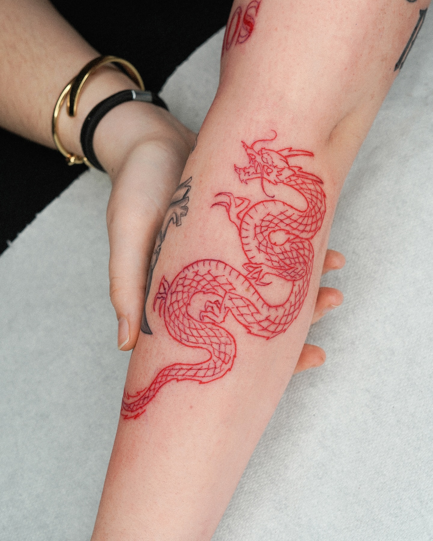 The tattoo features a striking red dragon design that winds elegantly along the arm.
