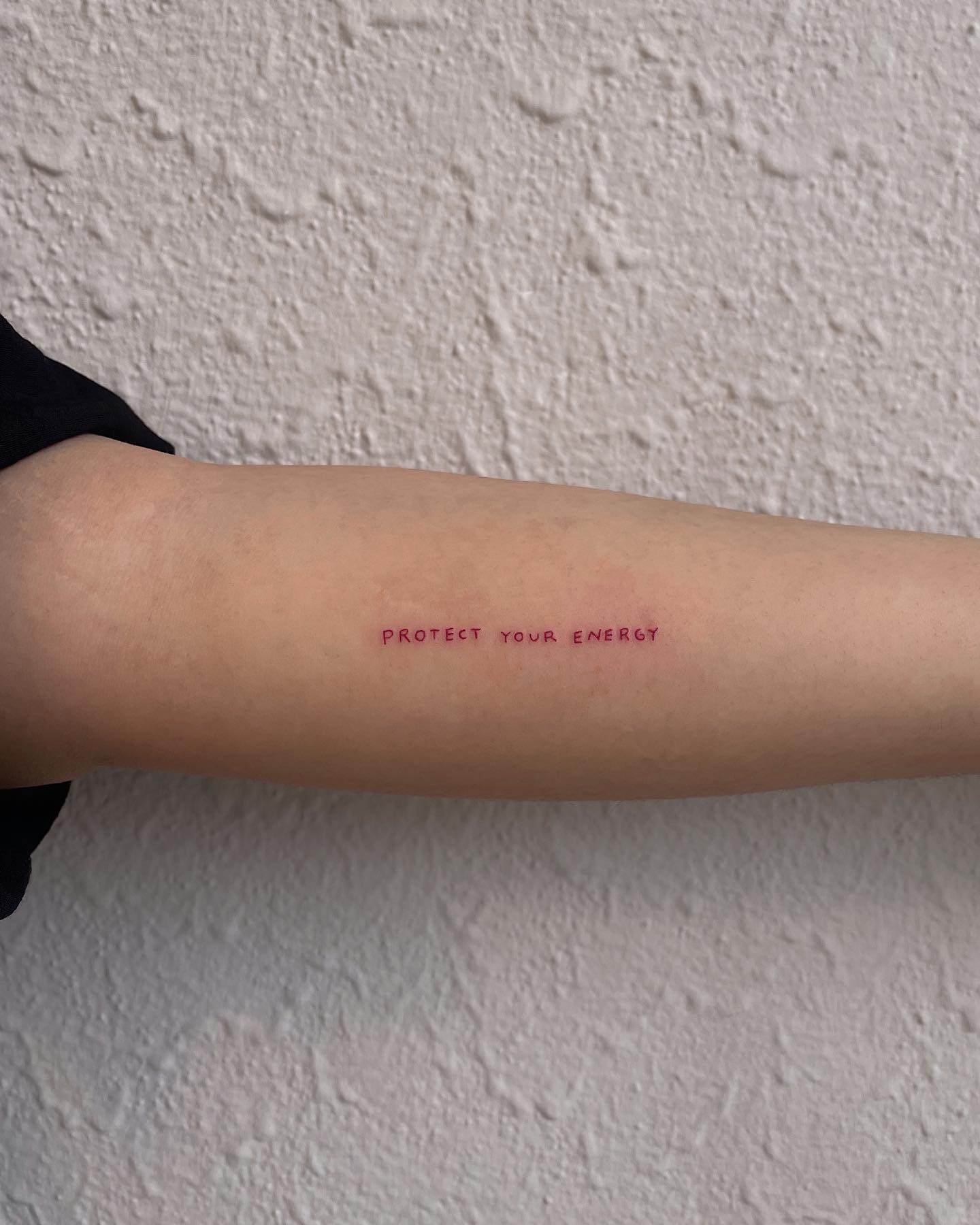 The tattoo features the phrase “PROTECT YOUR ENERGY” in a clear, bold red ink.