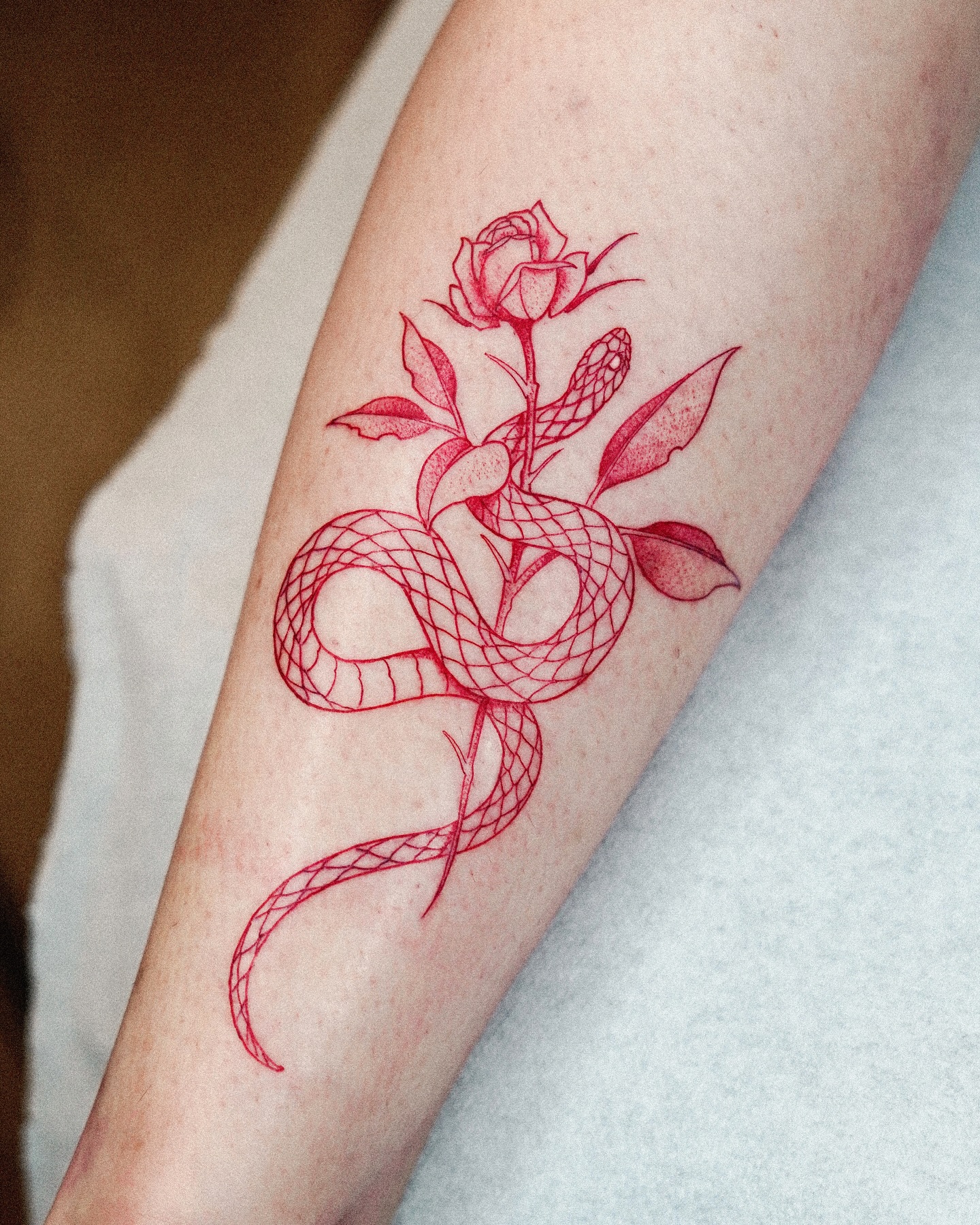 The intricate design features a snake entwined around a blooming rose, both rendered in detailed red ink.