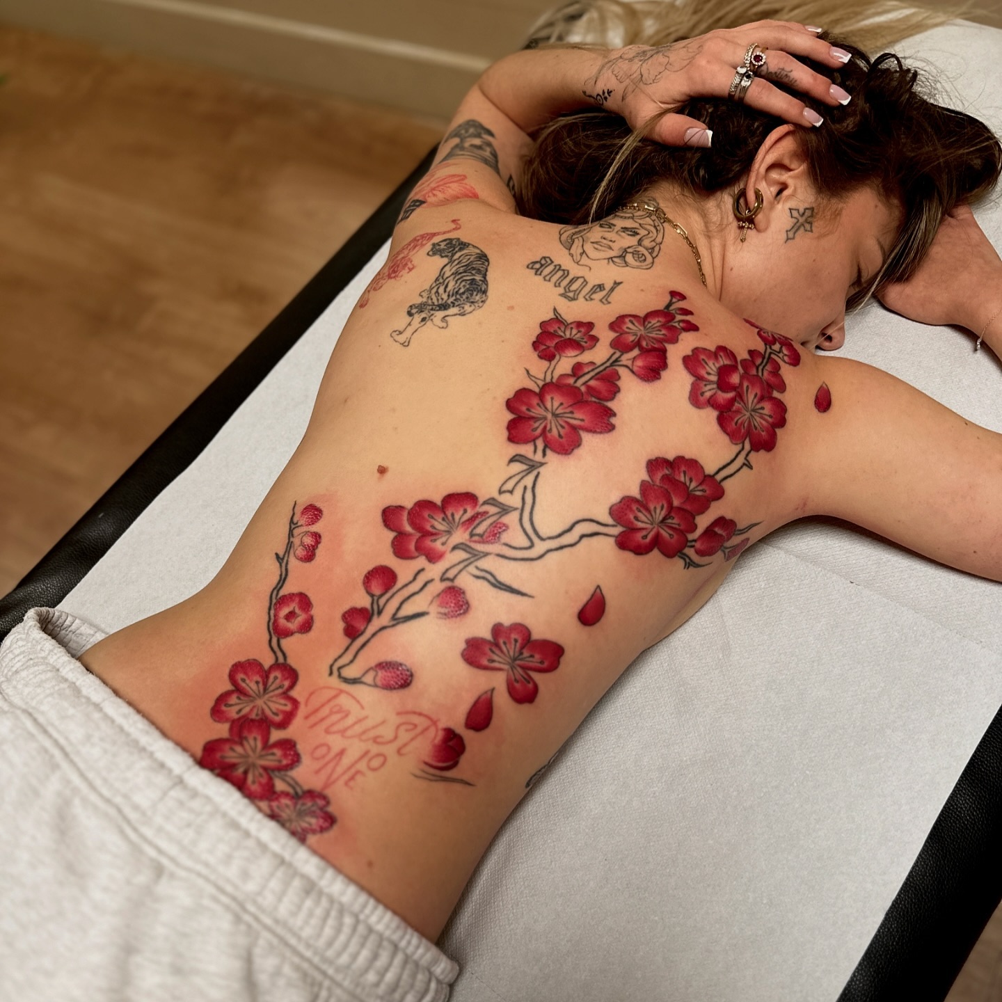 The tattoo features vibrant red flowers gracefully cascading along the side of the back.