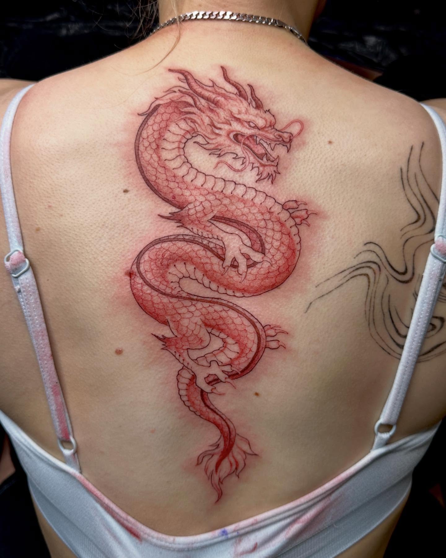 The intricate design of the red dragon tattoo features a flowing body that wraps gracefully across the back.