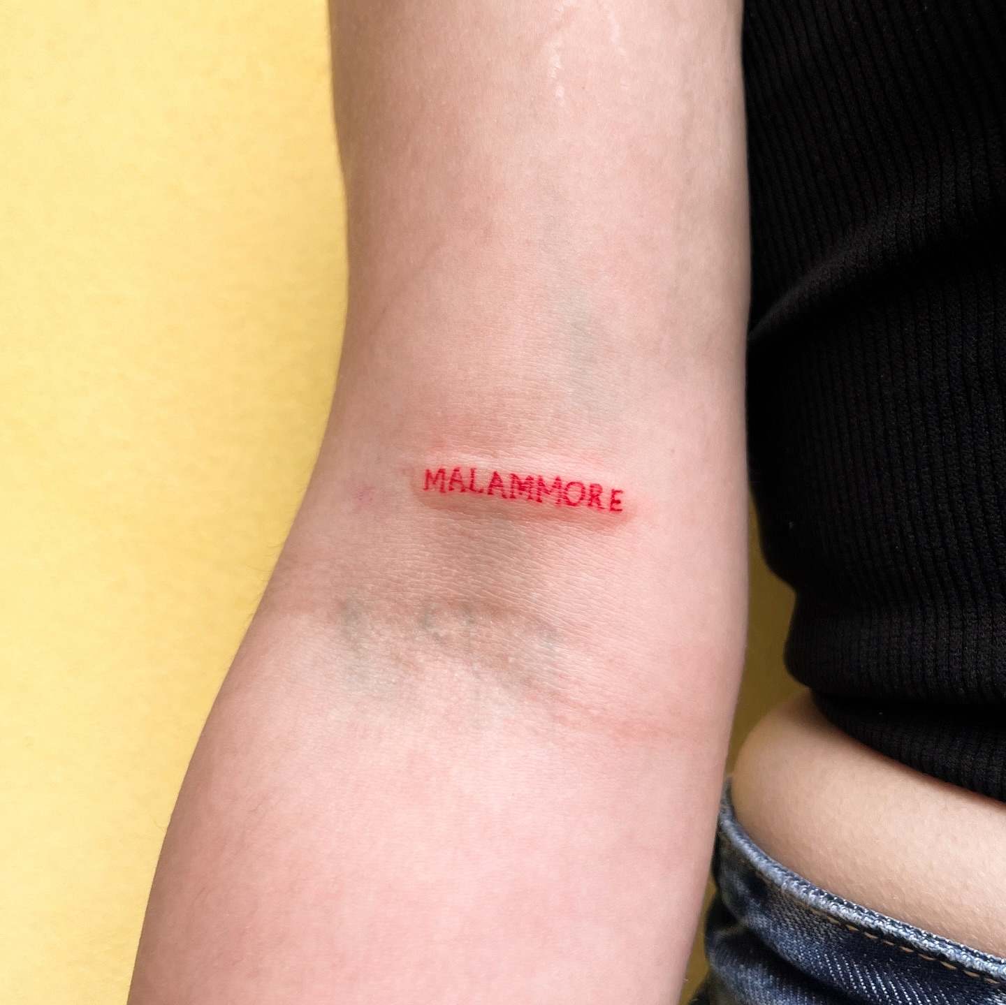 The tattoo features the word “MALAMMORE” inked in bright red, standing out against the light skin tone.