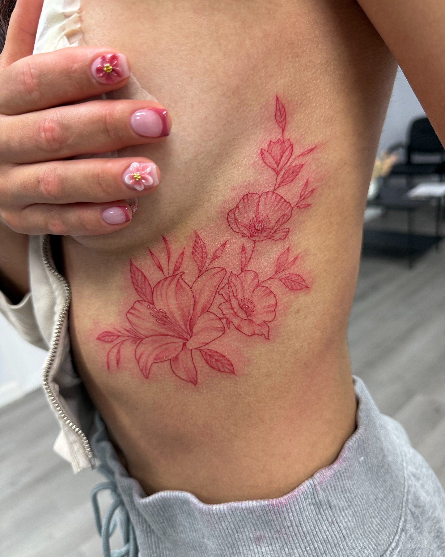 The tattoo features a slender, flowing design of flowers intertwined with elegant lines in a soft red hue.