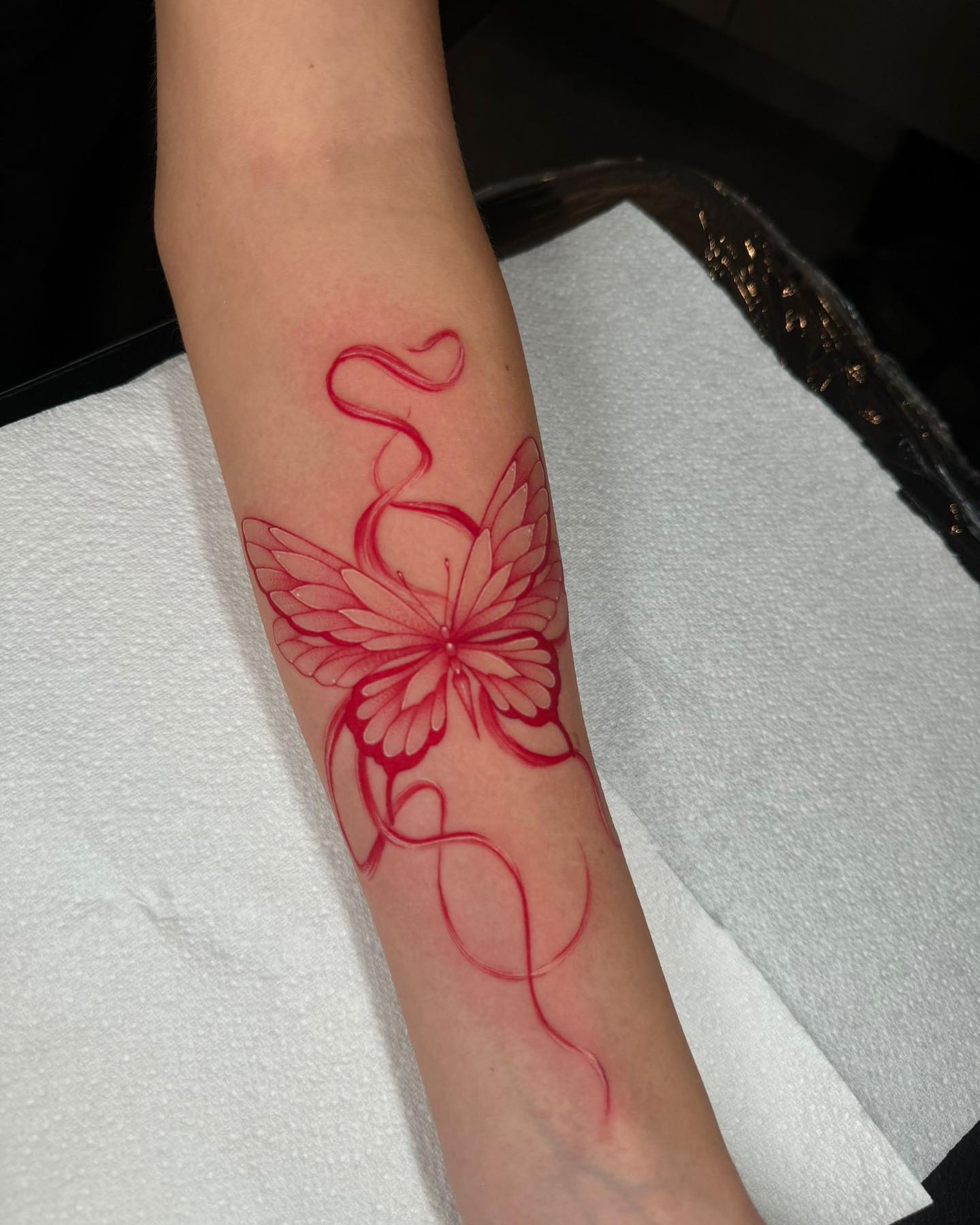 The striking red butterfly stands out against the skin, showcasing delicate wing details and smooth curves.
