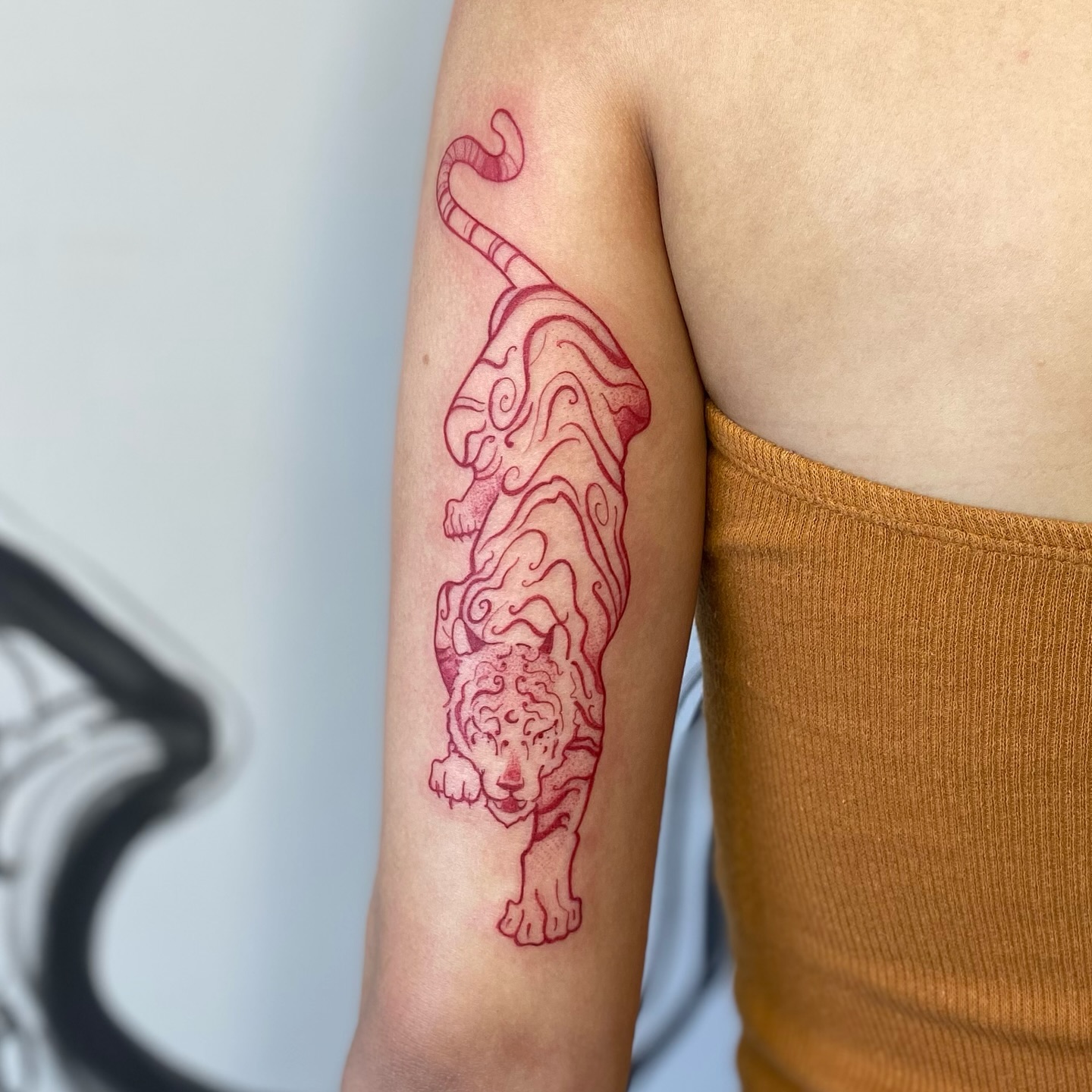 The striking red ink tattoo features a detailed tiger in a dynamic pose, showcasing its fierce expression and flowing lines.