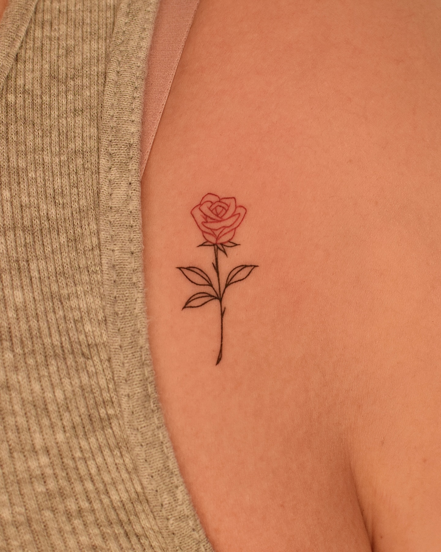 The tattoo features a finely detailed rose with a blend of red and black ink, showcasing both the flower and its stem.