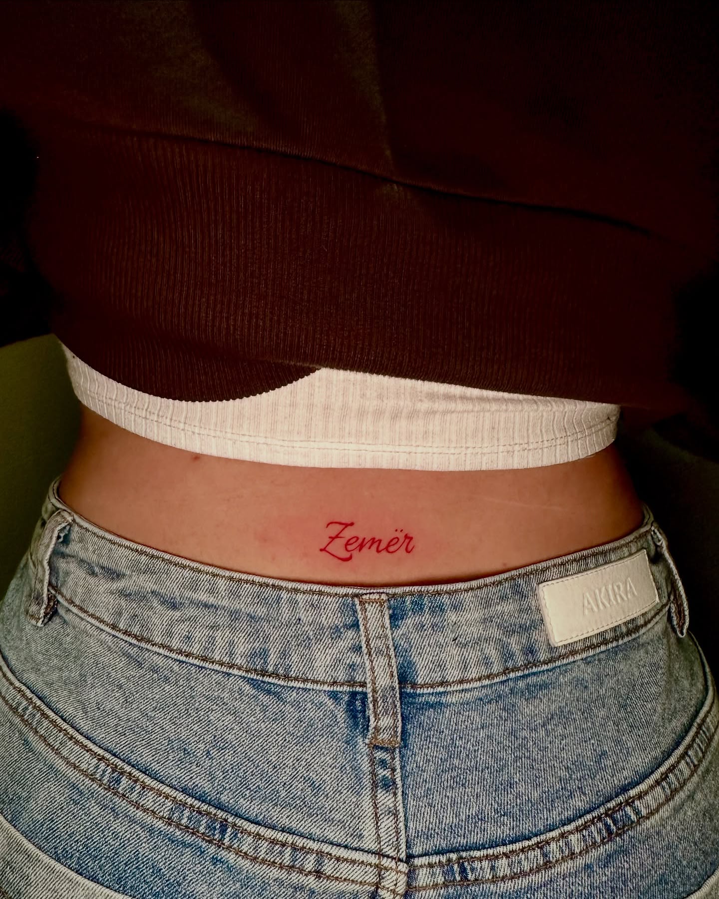 The tattoo features the word “Zemër” in a flowing script, prominently displayed on the lower back.