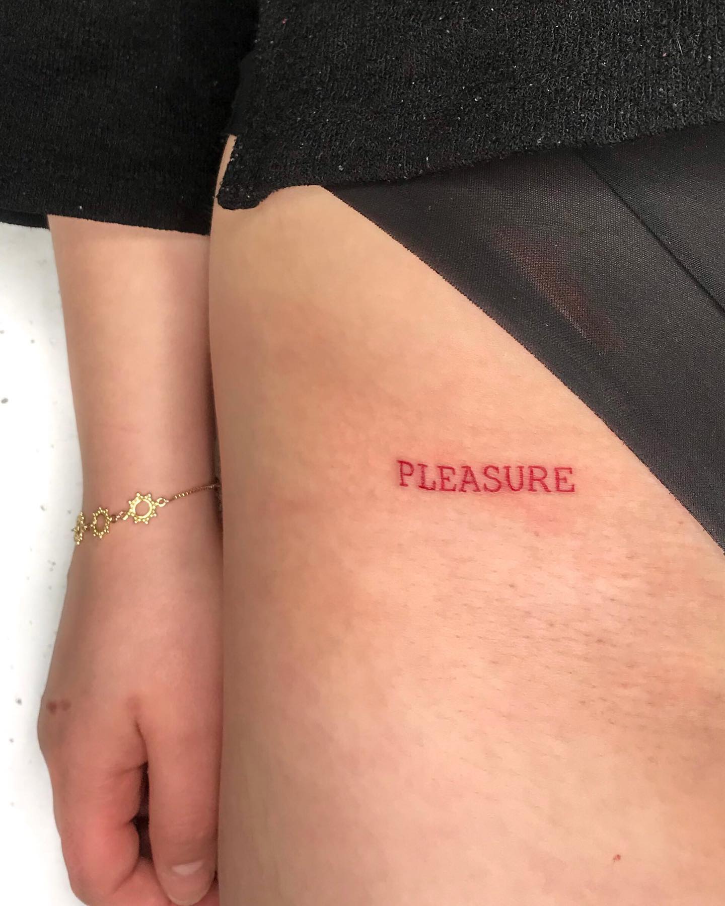 The tattoo features the word “PLEASURE” in a clean, bold red font that stands out against the skin.