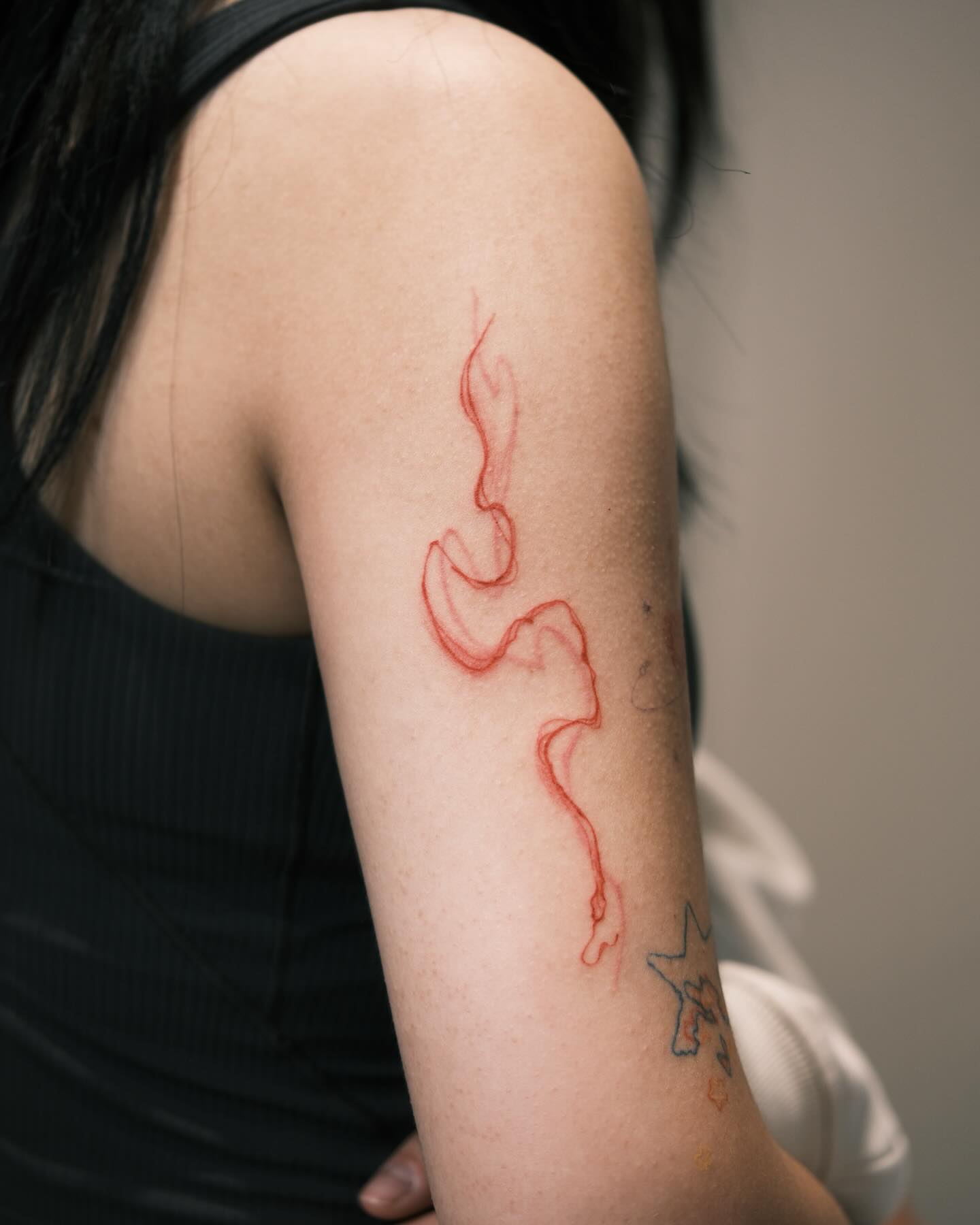 The tattoo features a fluid red design that spirals elegantly along the arm.