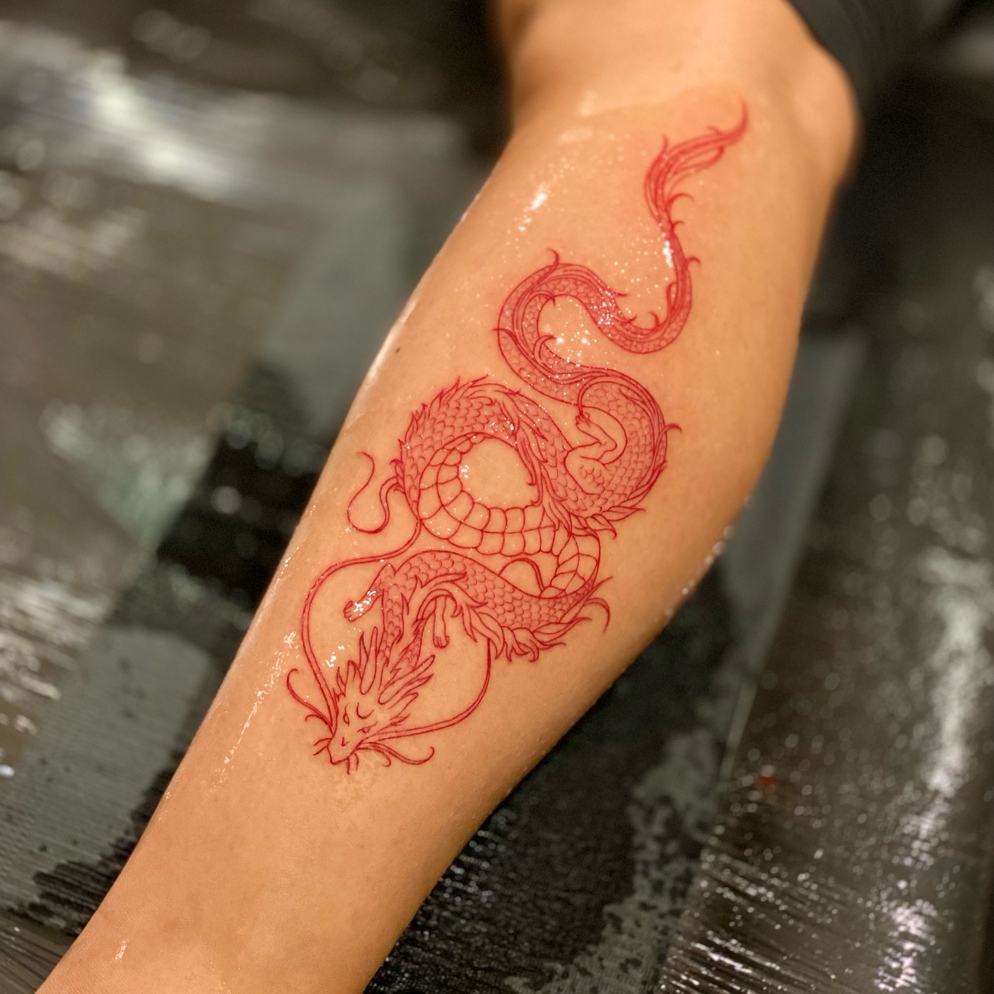 The use of fine lines and bold red ink creates a striking contrast against the skin, emphasizing the dragon’s scales and flowing form.