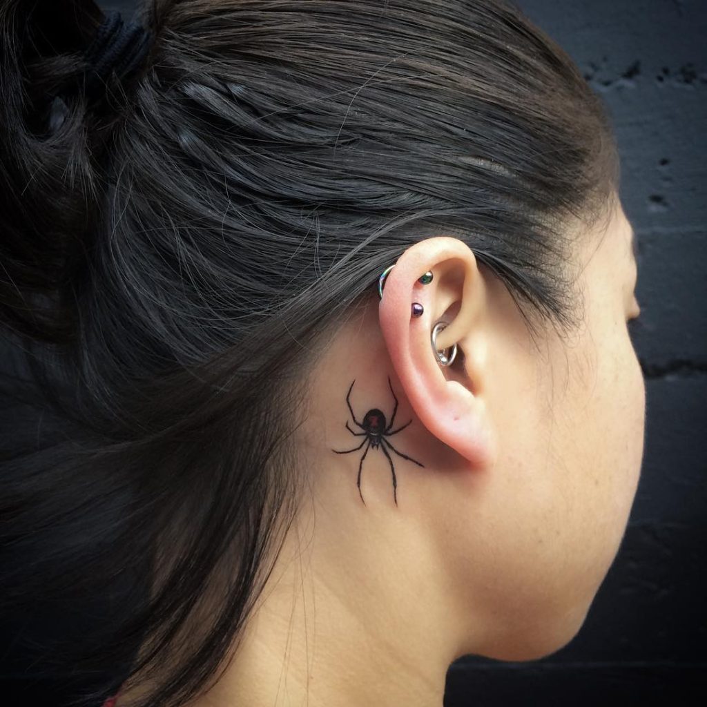 41. Striking Black Widow Spider Tattoo Behind the Ear