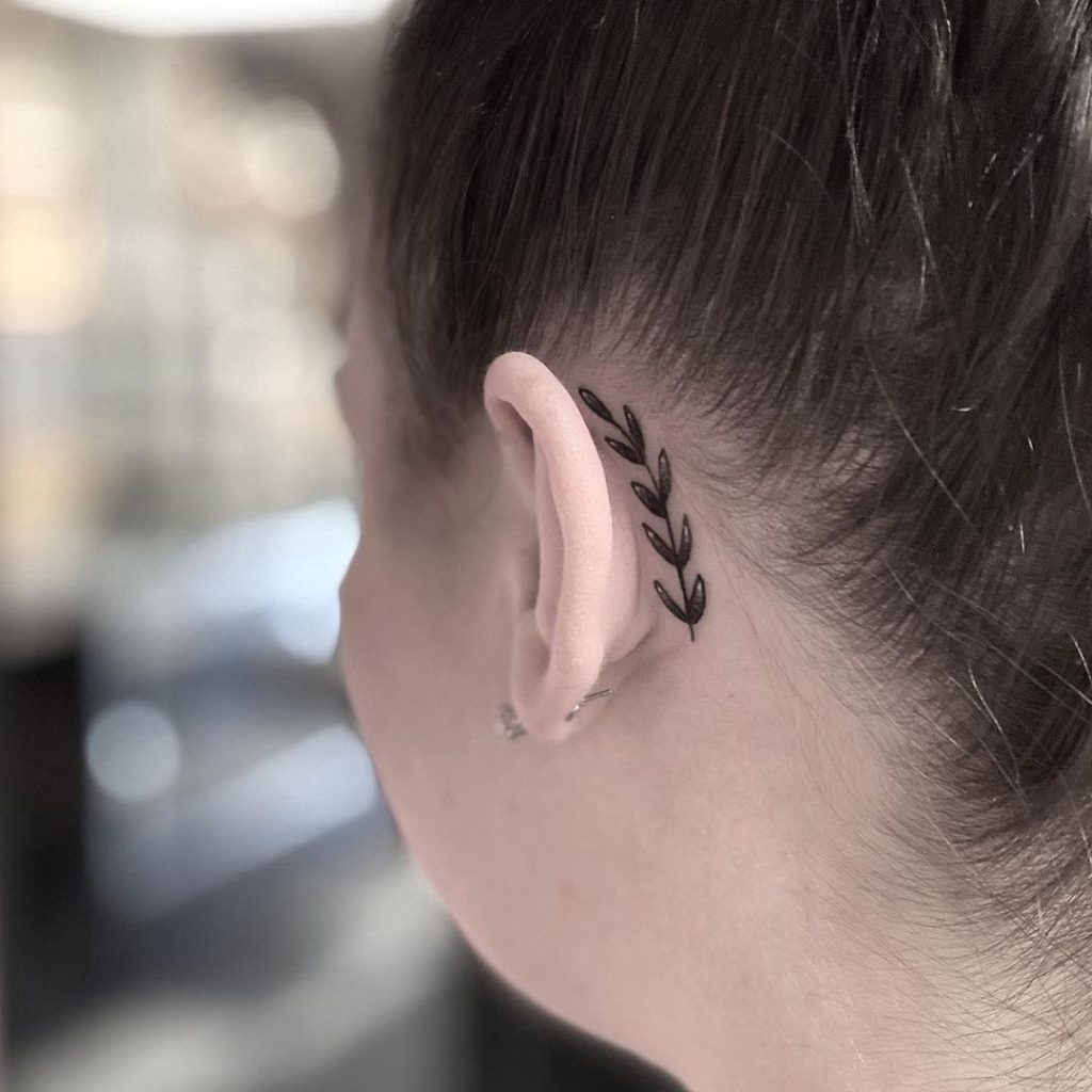 26. Minimalist Leaf Branch Tattoo Behind the Ear