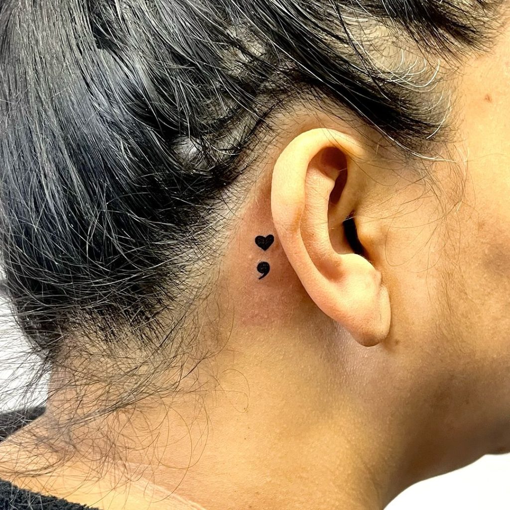 This simple yet meaningful tattoo combines a solid black heart with a semicolon, placed subtly behind the ear. The design is clean and minimal, symbolizing love, resilience, and continuation. It s a small but powerful reminder of strength and self-love.