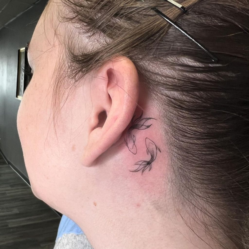 Two elegant koi fish swim in a yin-yang-like formation behind the ear, drawn in soft, fine black lines. The delicate design captures a sense of balance, harmony, and grace. Its placement makes it a serene yet subtly striking piece of body art.