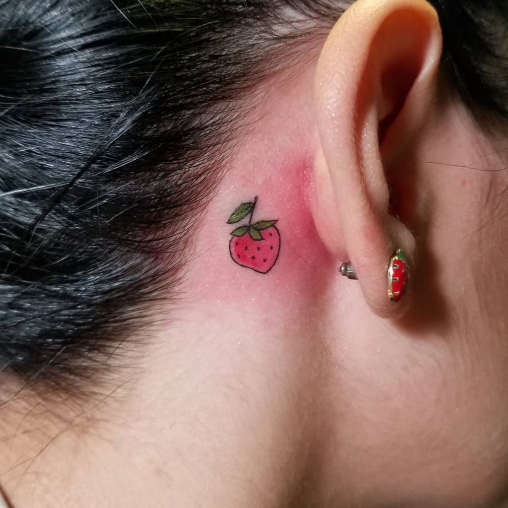 This adorable tattoo features a tiny, vibrant red strawberry with a pair of green leaves on top, tucked behind the ear. The bright colors and simple design make it playful and eye-catching. A symbol of sweetness and charm, this tattoo is as fun as it is unique!