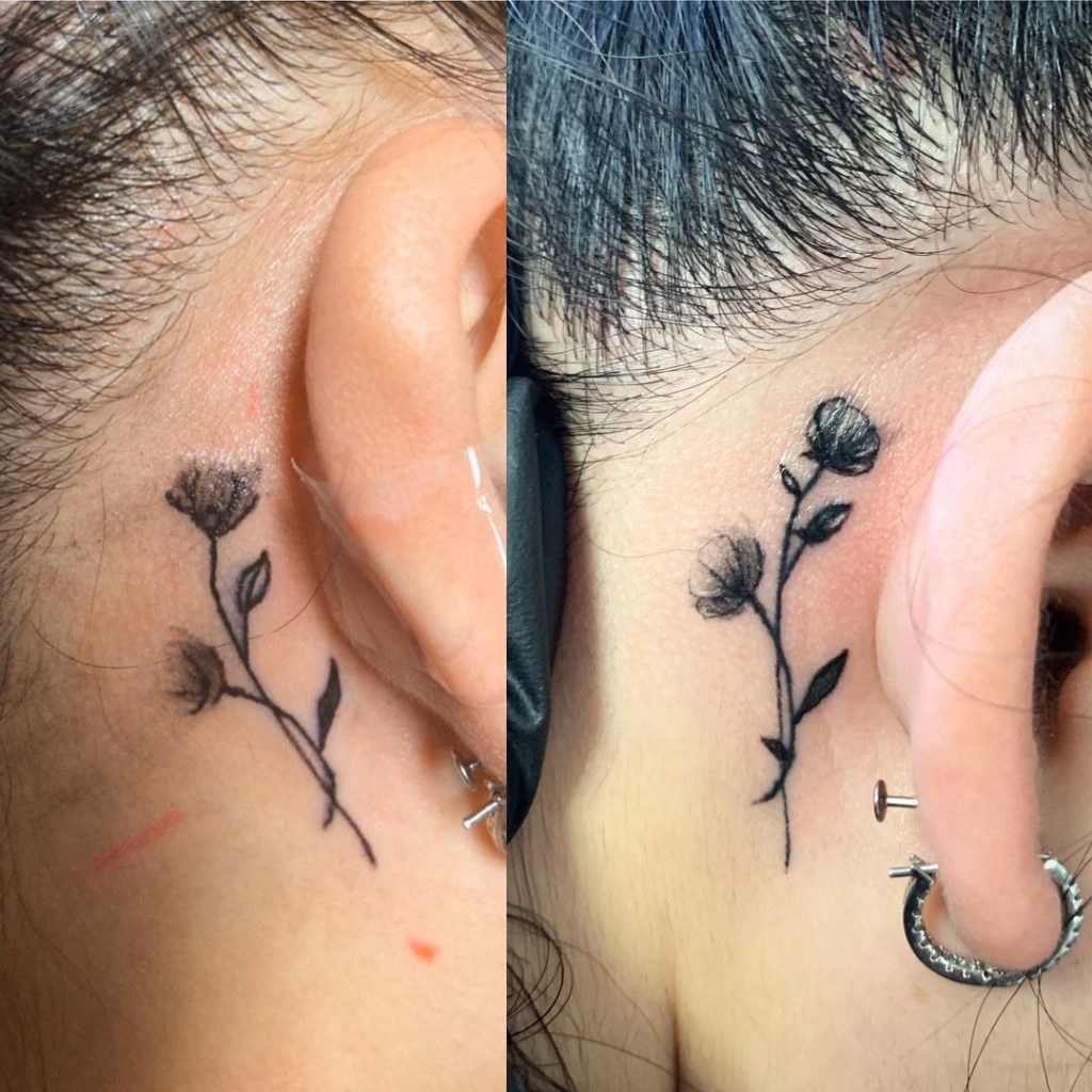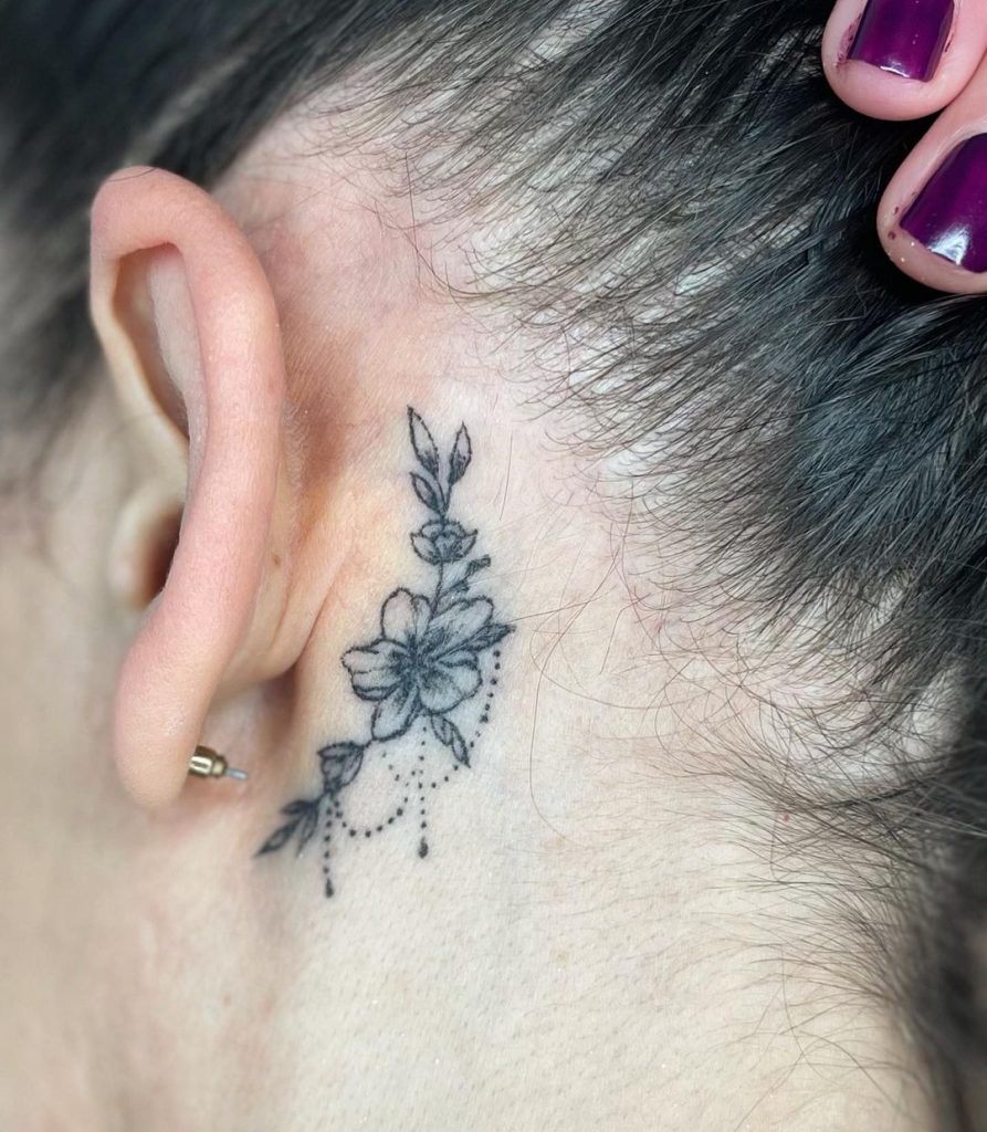 This elegant tattoo features a soft vine of flowers and leaves trailing gracefully behind the ear. The fine black lines and tiny dotted details add an intricate, whimsical touch. It s a lovely design that symbolizes natural beauty and growth, perfectly tucked into a subtle, intimate spot.