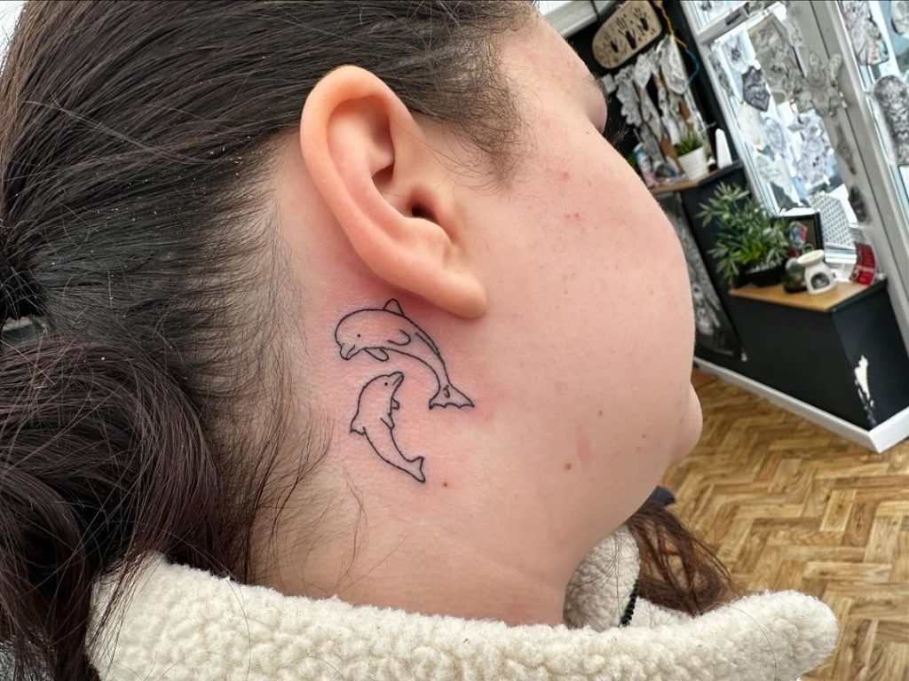 This charming tattoo features two dolphins gracefully swimming behind the ear, drawn with clean, simple lines. The playful interaction between the dolphins adds a lively, joyful energy to the design. Perfect for ocean lovers, it symbolizes freedom and harmony in a fun and subtle way.