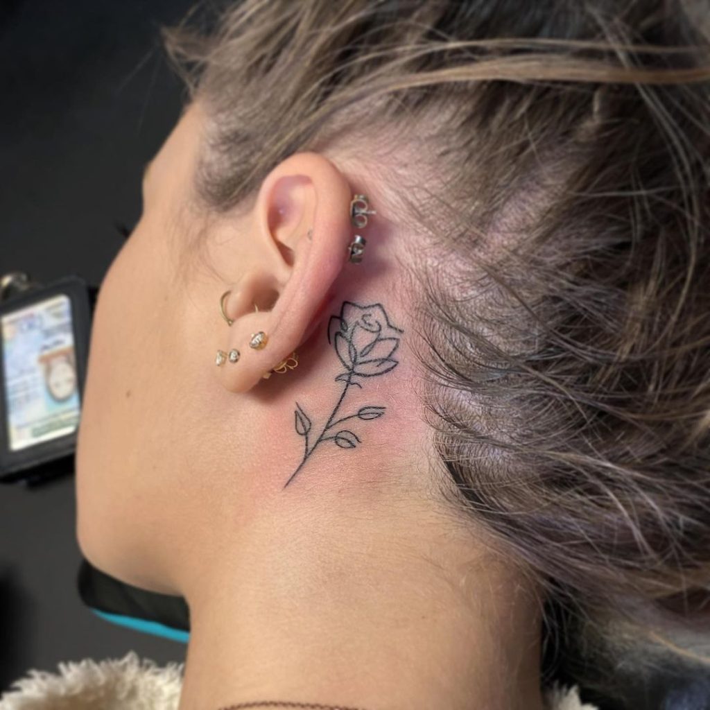 This delicate tattoo features a single rose outlined with fine black lines, showcasing its elegant petals and slender stem. The minimalist design adds a timeless and graceful touch behind the ear. Perfectly understated, it symbolizes love and beauty in a subtle, modern way.