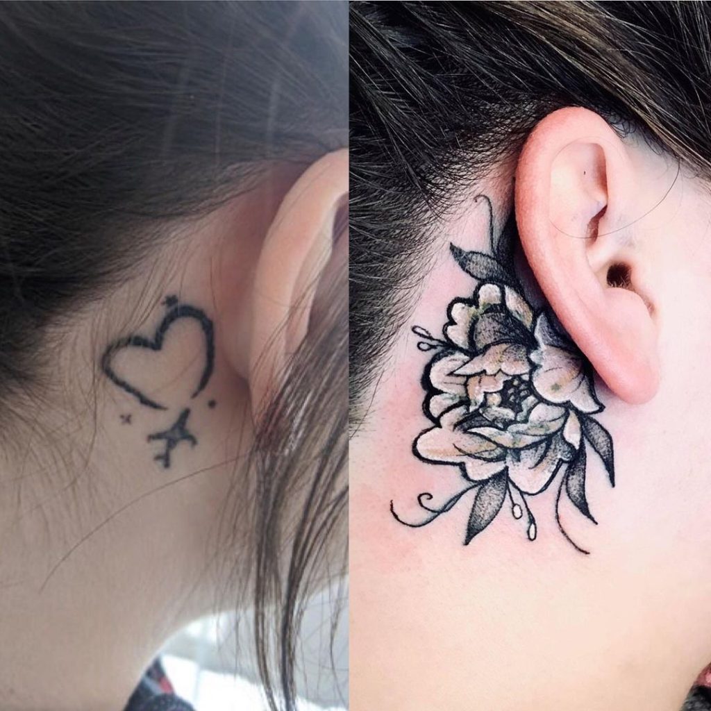 4. Minimalist Heart and Bold Floral Bloom Tattoo Behind the Ear