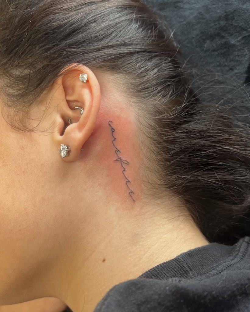 This elegant tattoo spells the word “carefree” in a delicate, cursive font that flows gracefully behind the ear. The fine linework gives it a light and effortless look, perfectly complementing the meaning of the word. It’s a subtle and stylish reminder to embrace freedom and joy.