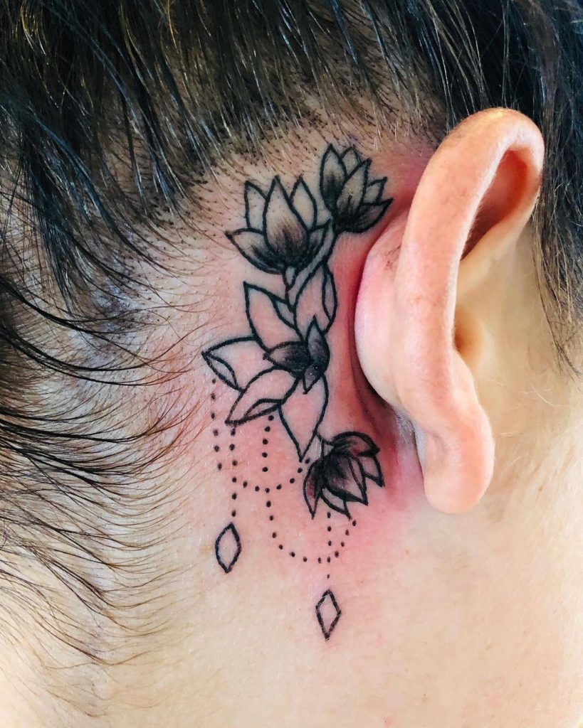22. Lotus Blossom and Dangle Tattoo Behind the Ear