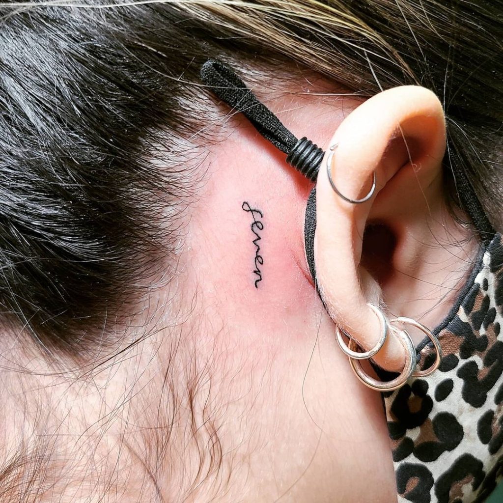 32. Minimalist ‘Seven’ Script Tattoo Behind the Ear