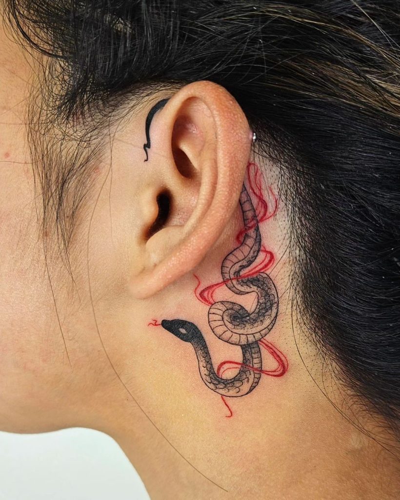 This bold tattoo features a coiled black snake with detailed scales, its head emerging near the jawline, surrounded by flowing red accents that resemble smoke or energy. The vivid contrast between the red and black creates a powerful and dynamic look. A symbol of transformation and strength, this design makes a fierce statement in its unique placement.