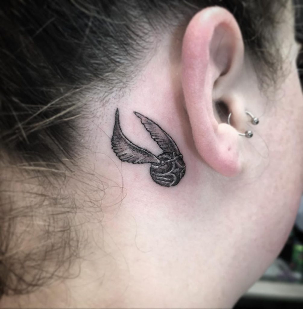 This tattoo features the iconic Golden Snitch, complete with intricately detailed wings that appear ready to take flight. The small and subtle design is perfectly tucked behind the ear, symbolizing speed, skill, and the thrill of chasing dreams. It’s a magical nod to adventure and victory.