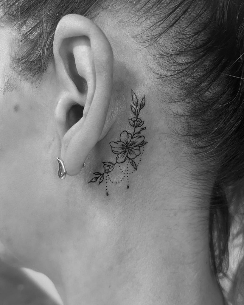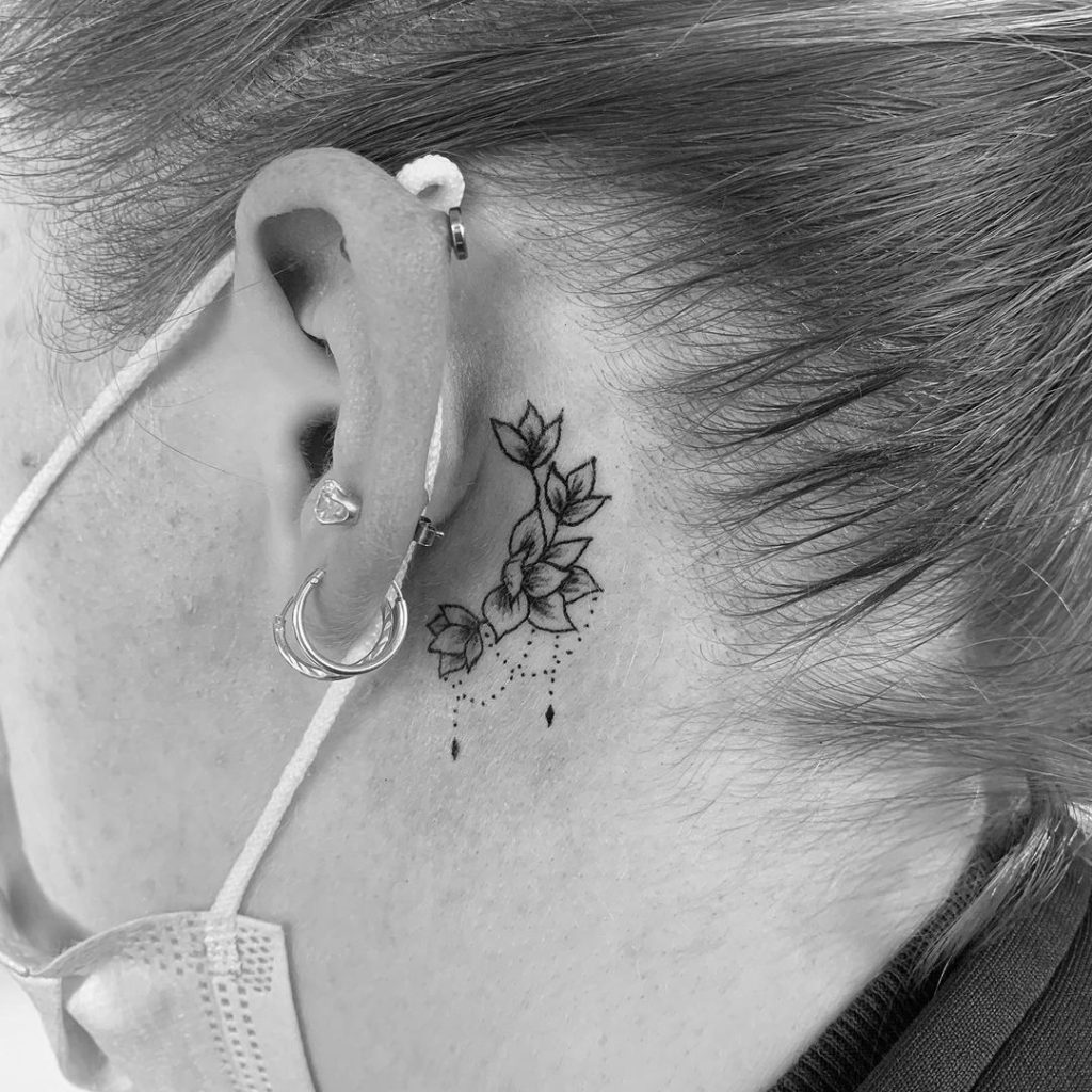 This stunning tattoo features a delicate flower with trailing leaves, adorned with fine dotted details resembling elegant beaded drapes. The intricate linework adds a graceful and feminine touch. Perfectly placed behind the ear, it symbolizes beauty and sophistication in a subtle yet captivating design.