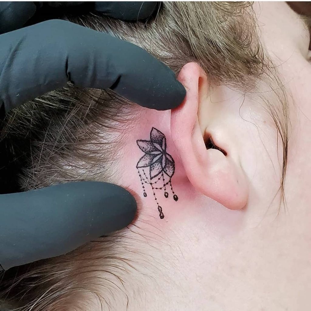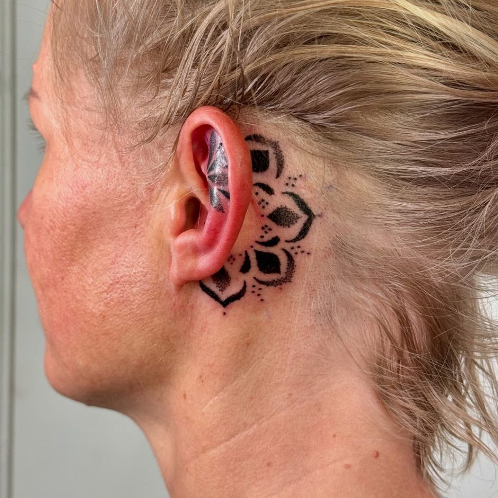 9. Mandala-Inspired Floral Tattoo Behind the Ear