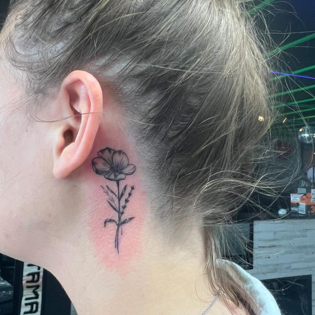 This delicate tattoo features a single blooming wildflower with a slim stem and dainty leaves. The soft shading and fine details give the design a natural and graceful feel. Positioned behind the ear, it s a subtle nod to beauty, growth, and simplicity.