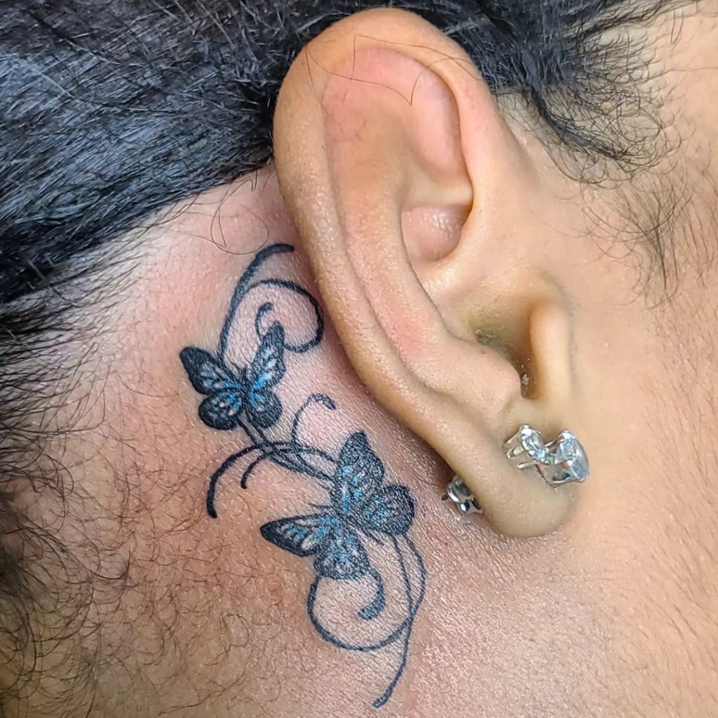 This enchanting tattoo showcases three elegant butterflies in flight, surrounded by delicate swirling lines that add movement and grace. The black ink shading gives the butterflies a bold yet delicate look. Positioned behind the ear, it symbolizes transformation, freedom, and the beauty of nature.