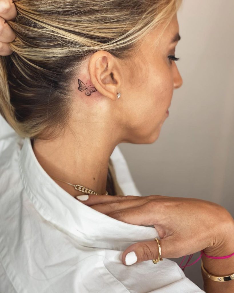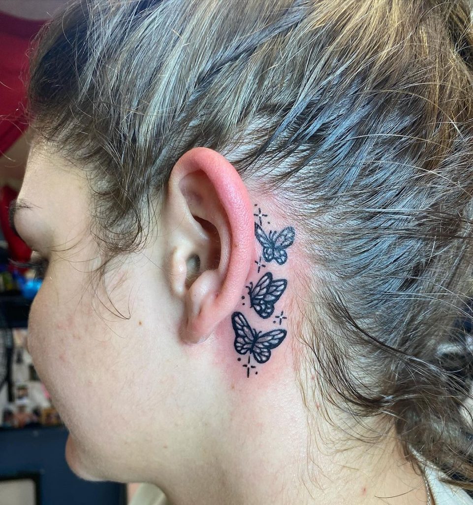 16. Fluttering Butterflies Tattoo Behind the Ear
