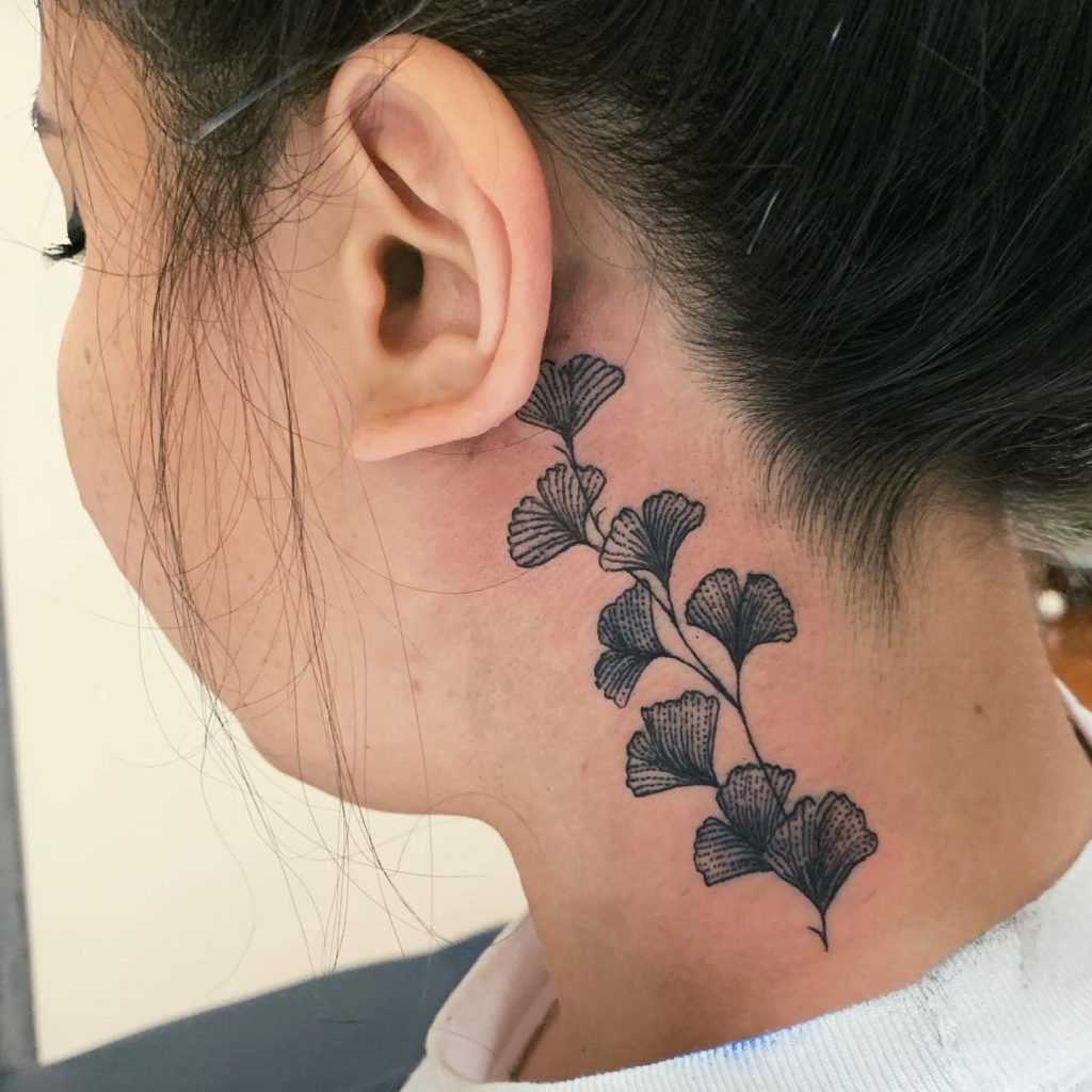 This graceful tattoo showcases a flowing branch of ginkgo leaves, delicately etched in intricate black lines. The fan-shaped leaves create a sense of movement and natural beauty as they trail behind the ear and down the neck. A timeless symbol of resilience and longevity, this design is both bold and refined.