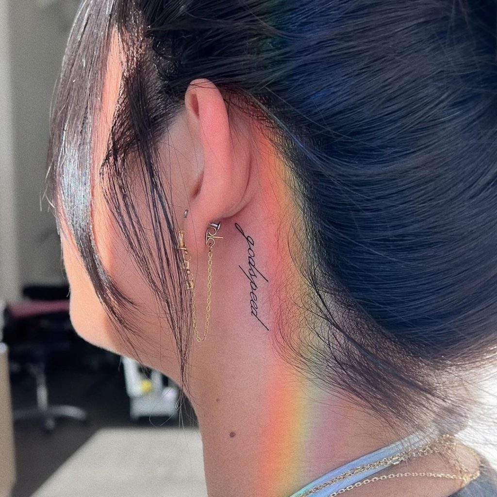 1. Elegant ‘Godspeed’ Tattoo Behind the Ear
