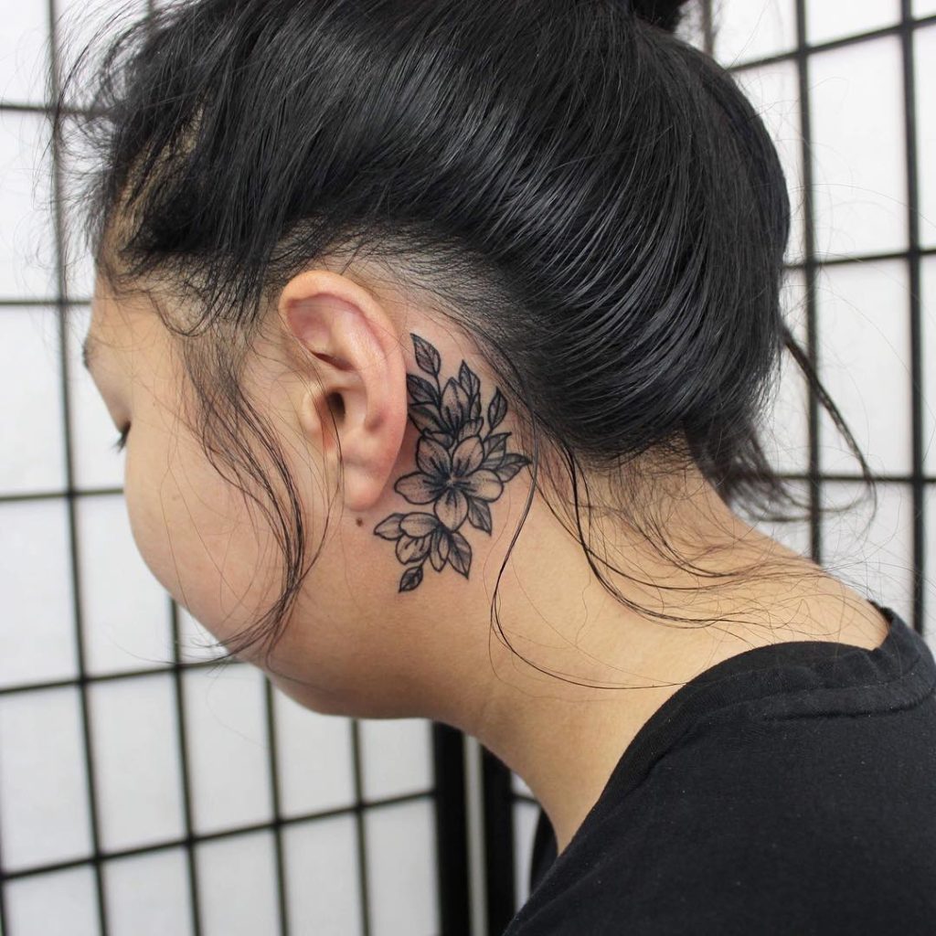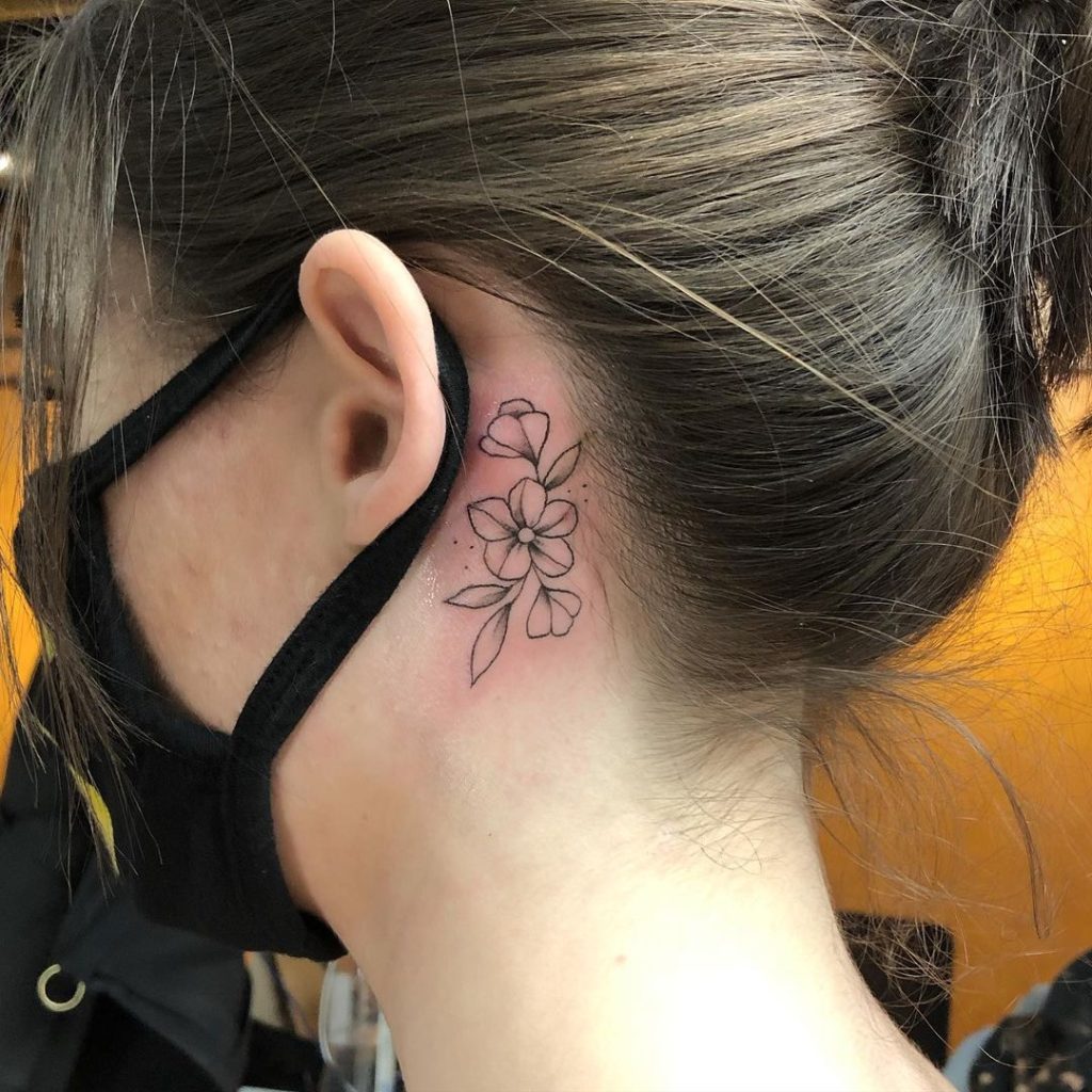 This graceful tattoo showcases a cluster of simple flowers with fine petals and leafy accents, beautifully placed behind the ear. The clean black outlines add a soft, natural elegance. It s a charming symbol of beauty and growth, perfect for a subtle yet striking design.