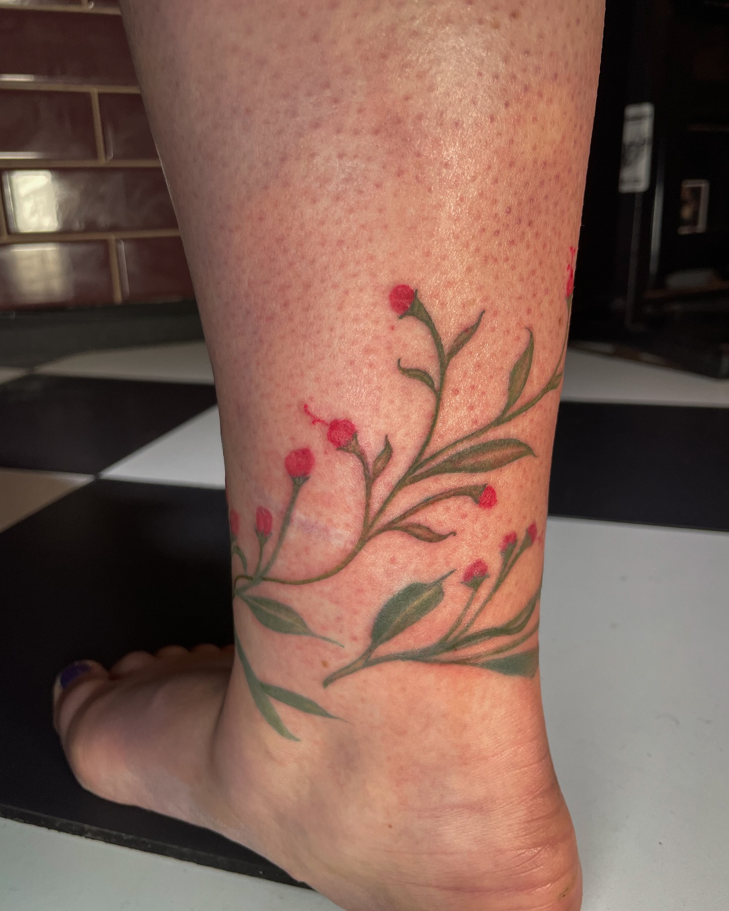 The tattoo features a delicate arrangement of green leaves intertwined with bright red buds.
