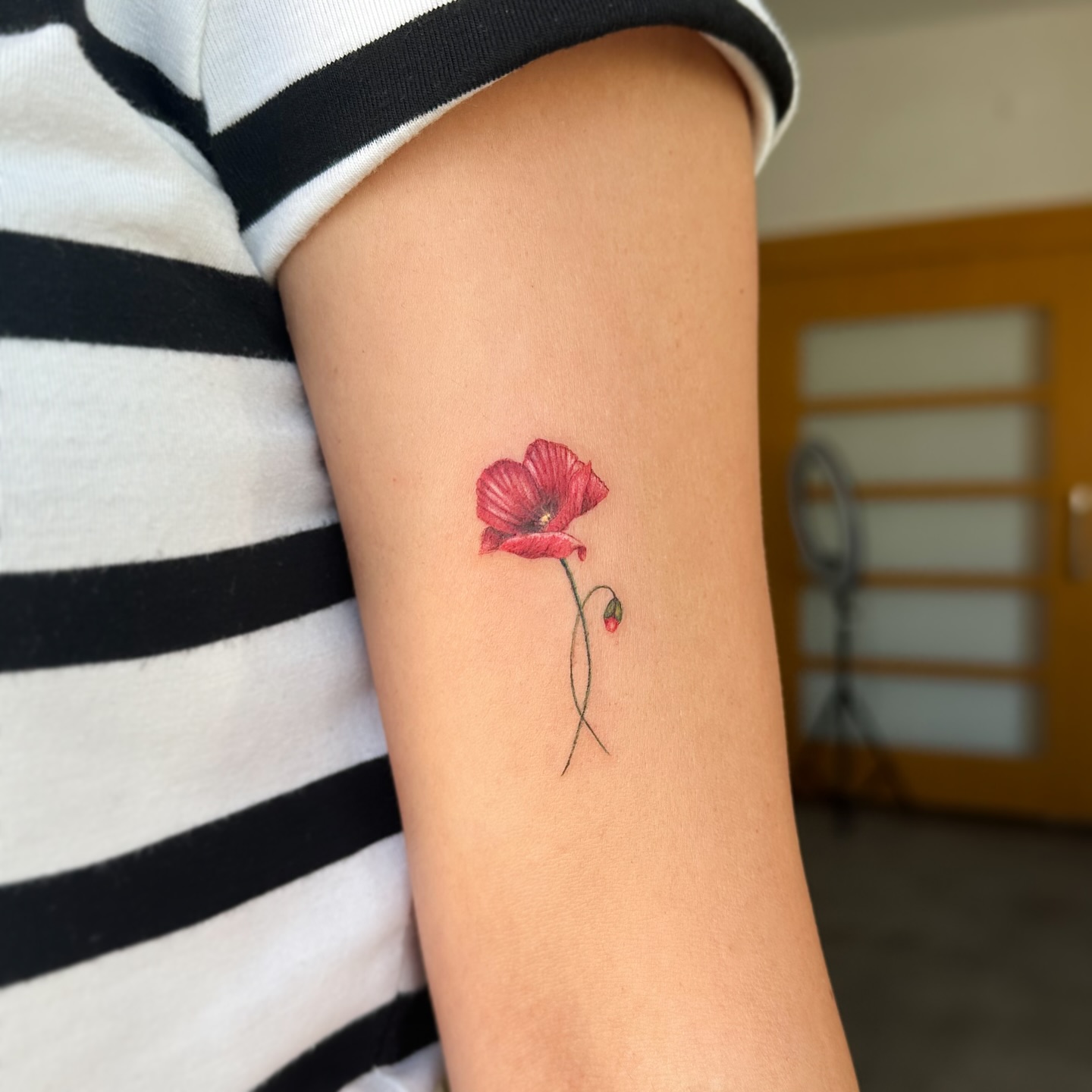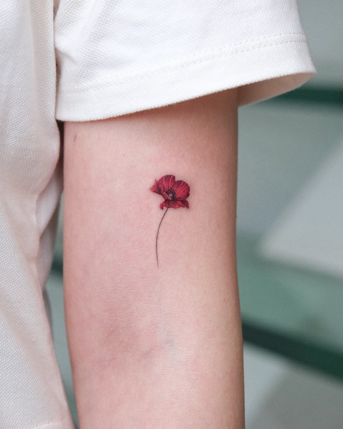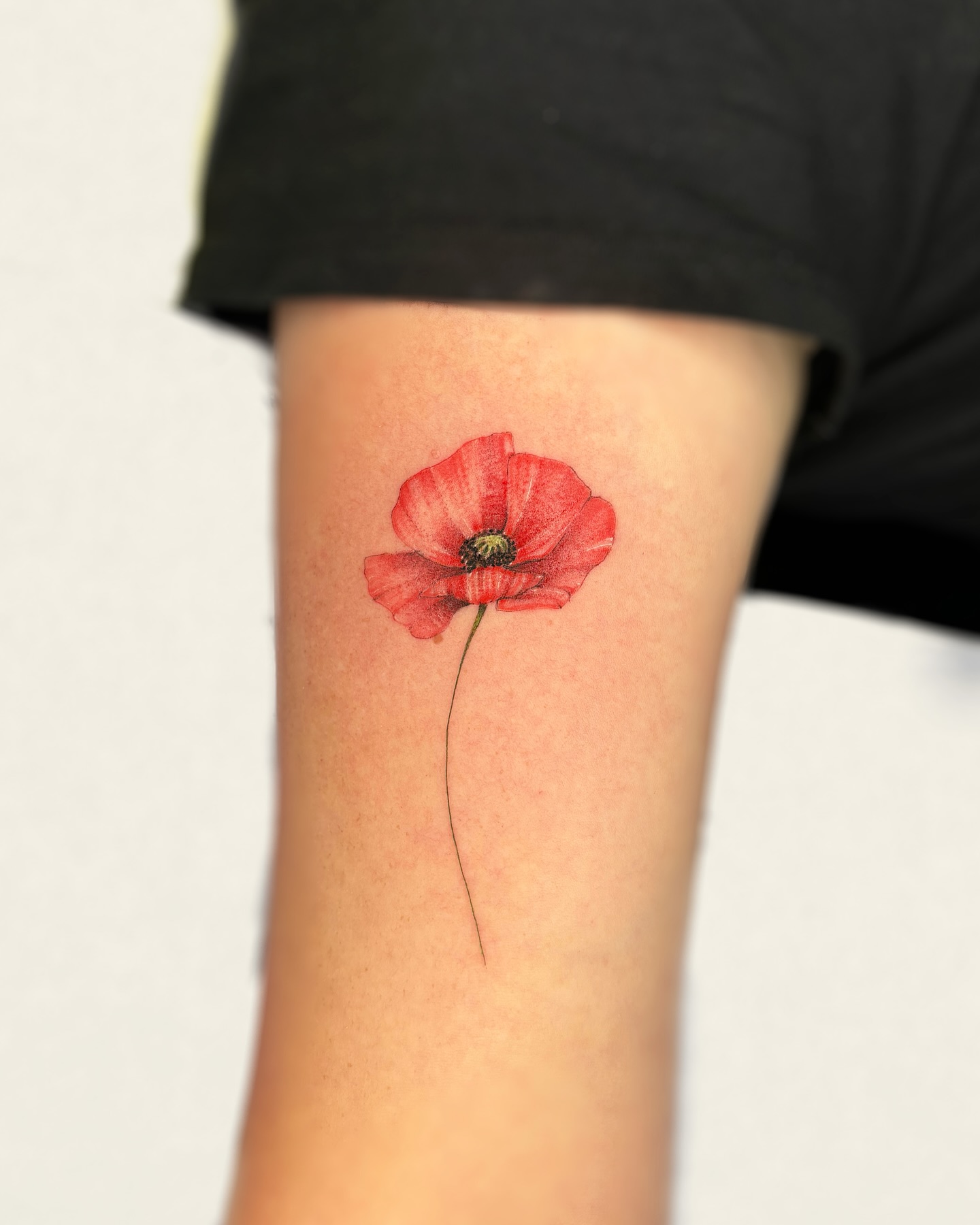 The tattoo features a small poppy with vibrant red petals and a slender black stem, showcasing intricate details.