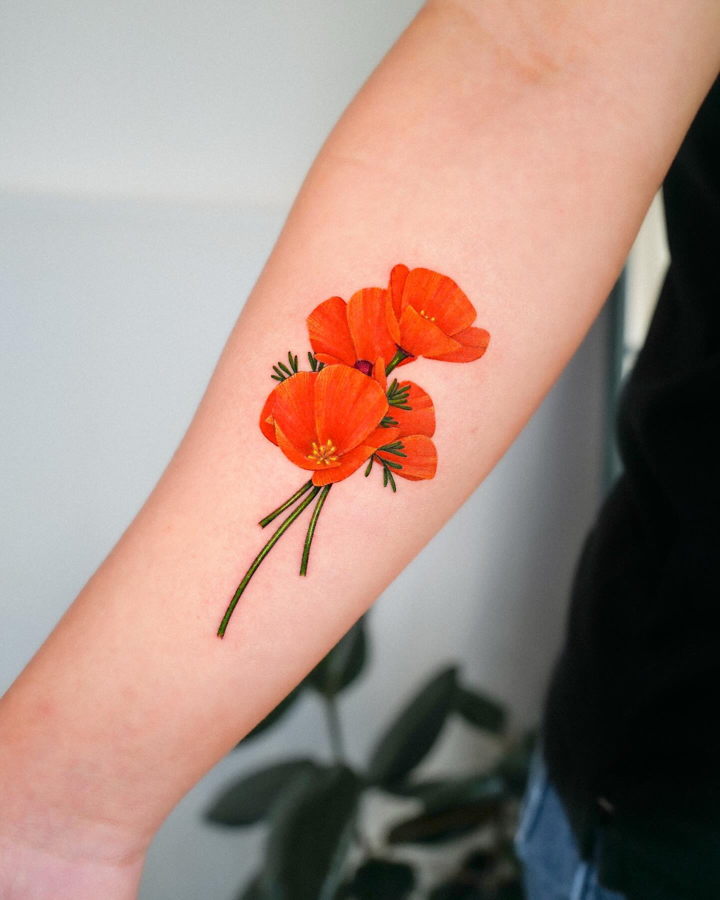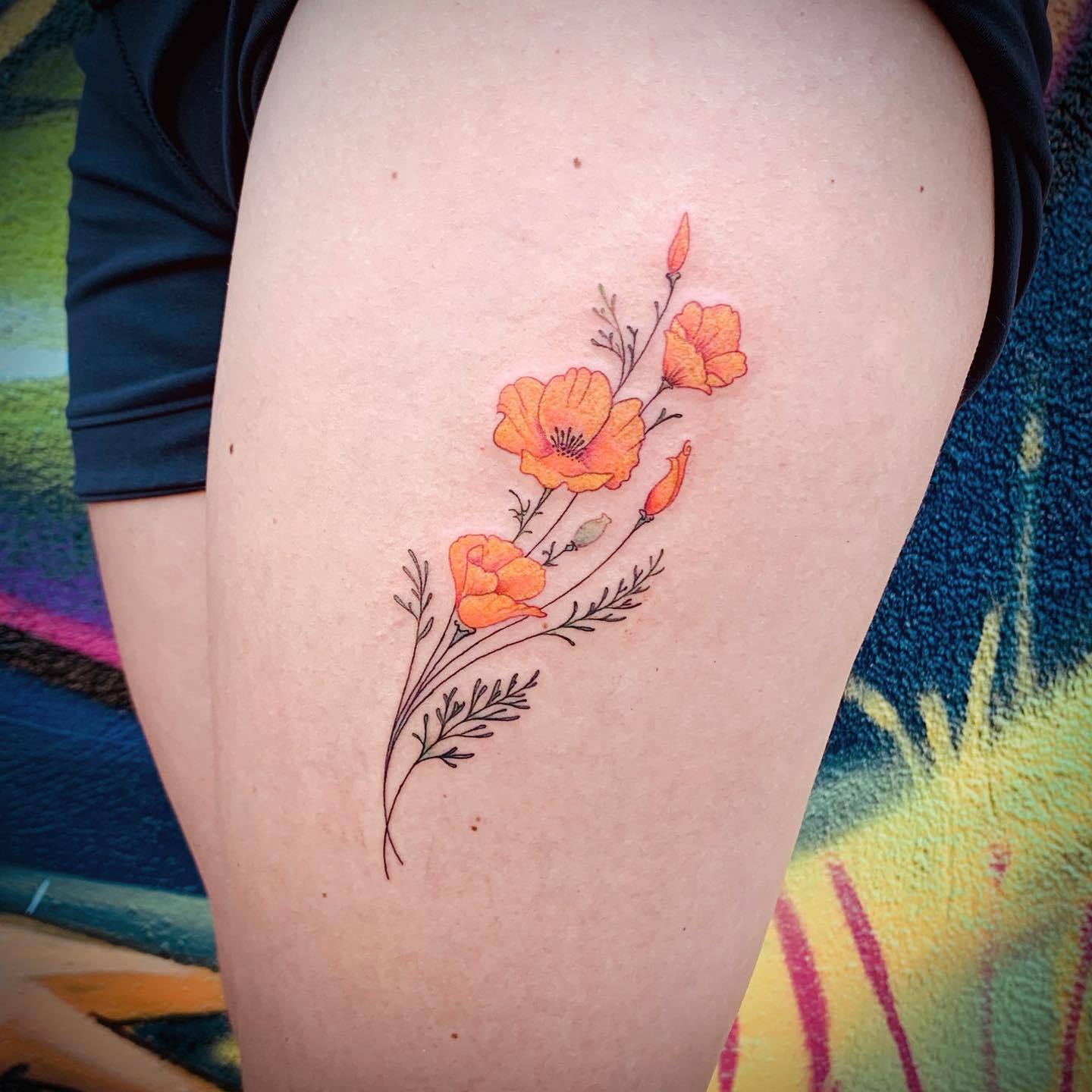 The tattoo features a vivid cluster of orange poppies, showcasing their distinct petals and delicate details.