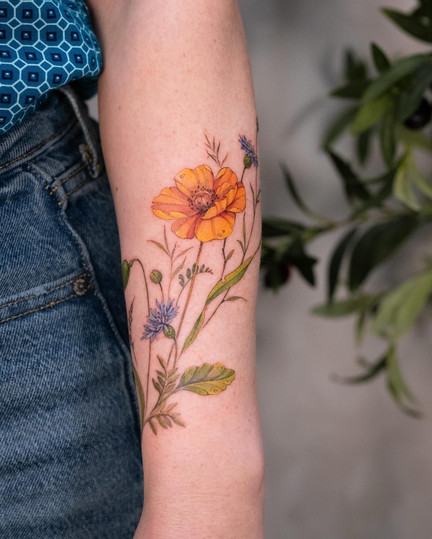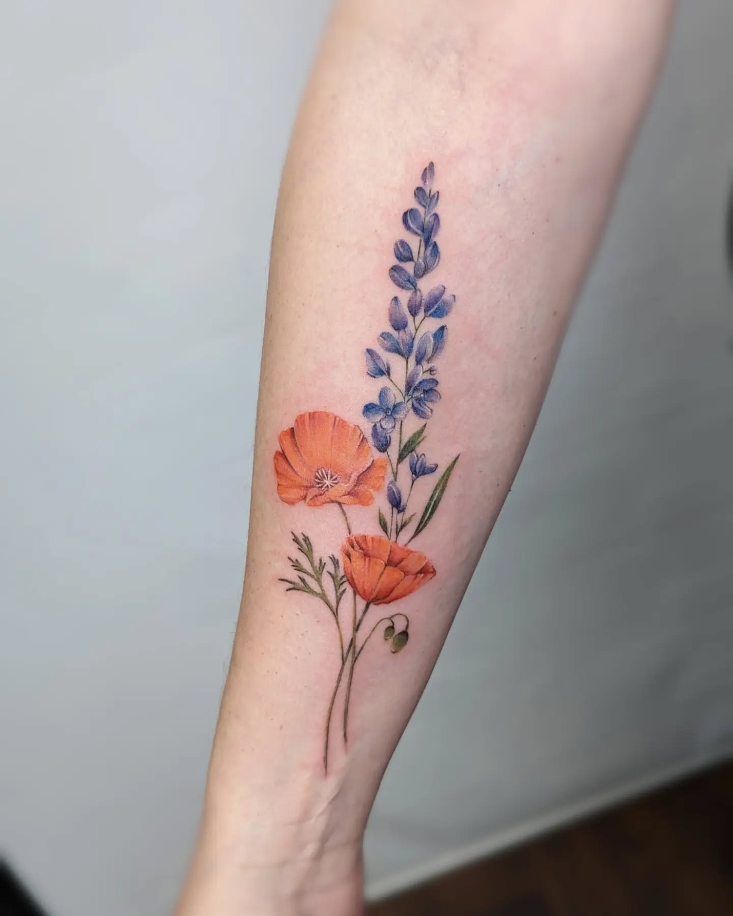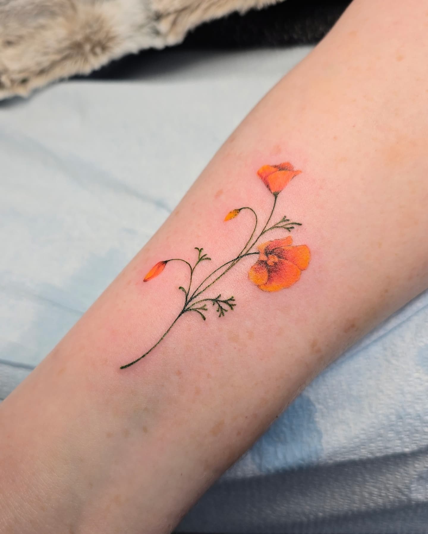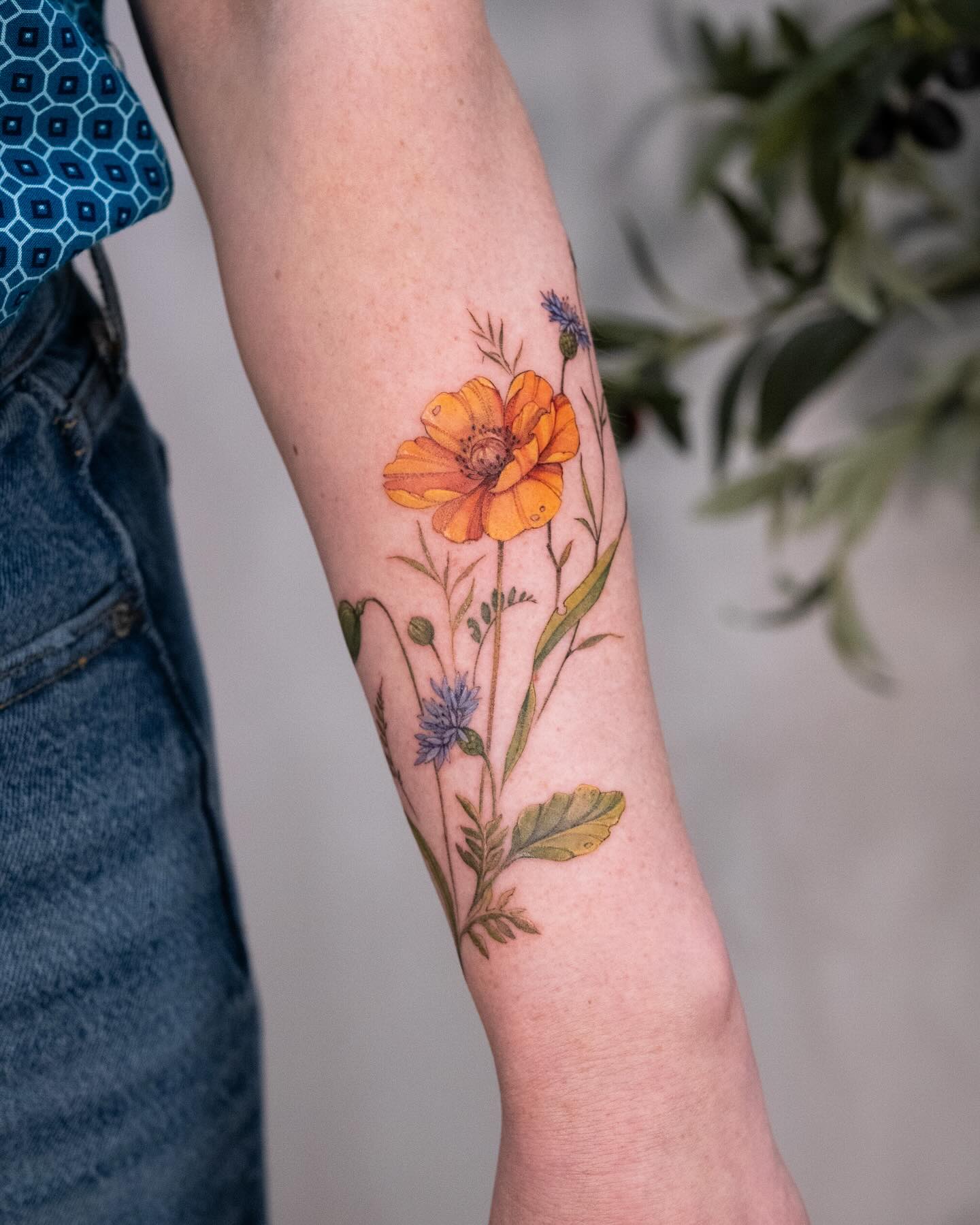 The tattoo features a bright orange poppy surrounded by delicate green leaves and small blue flowers.