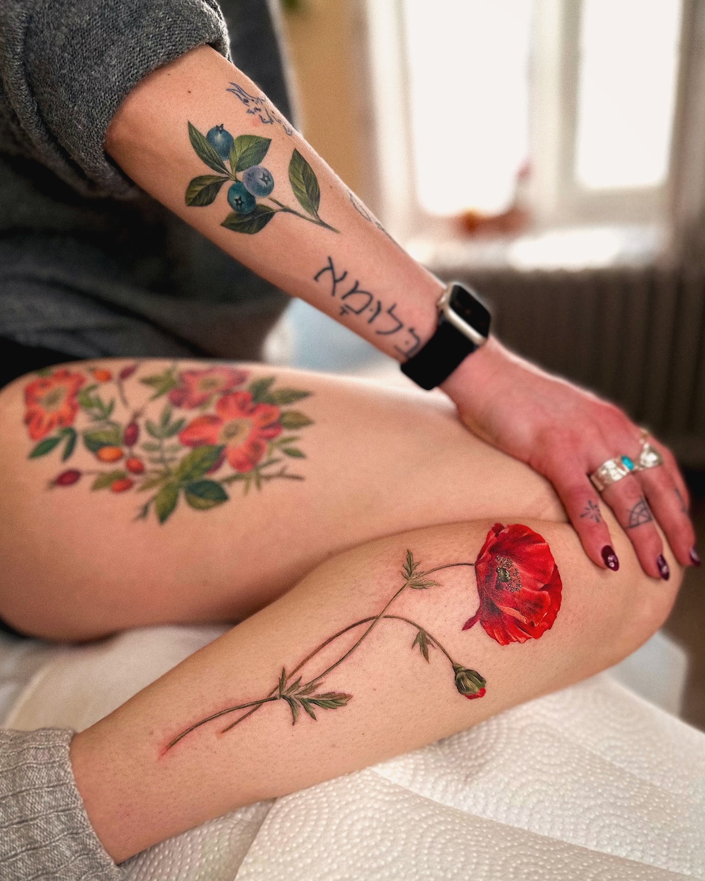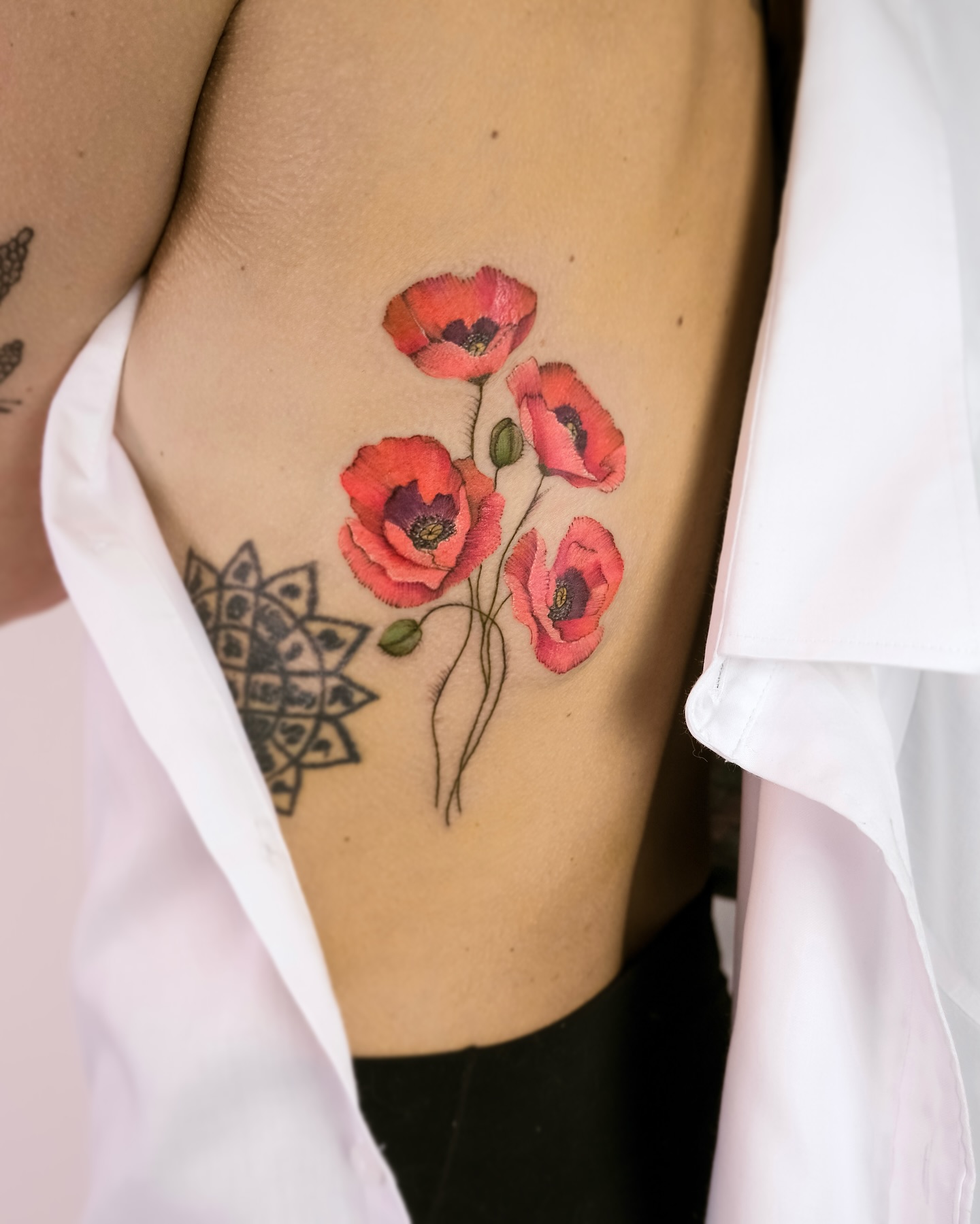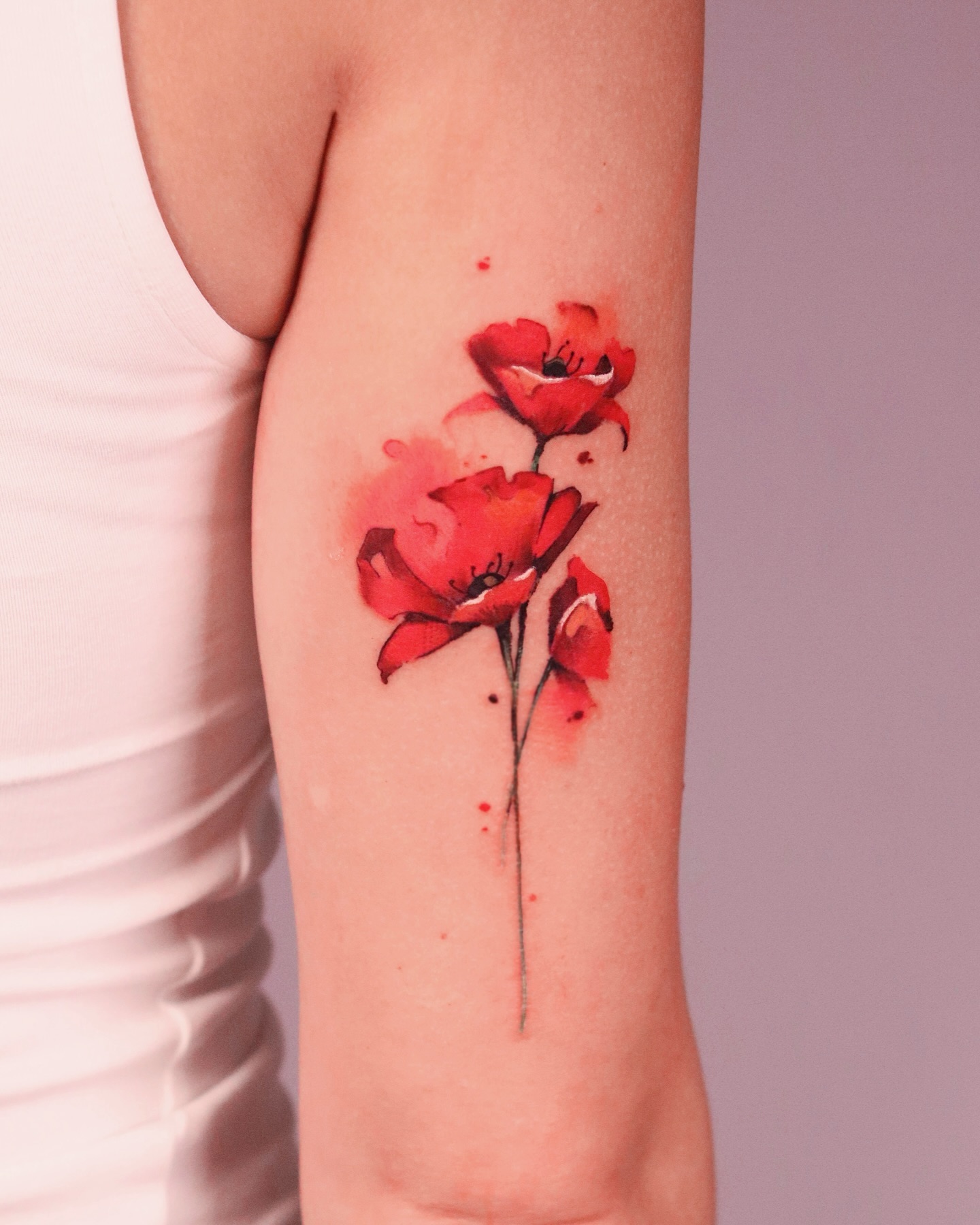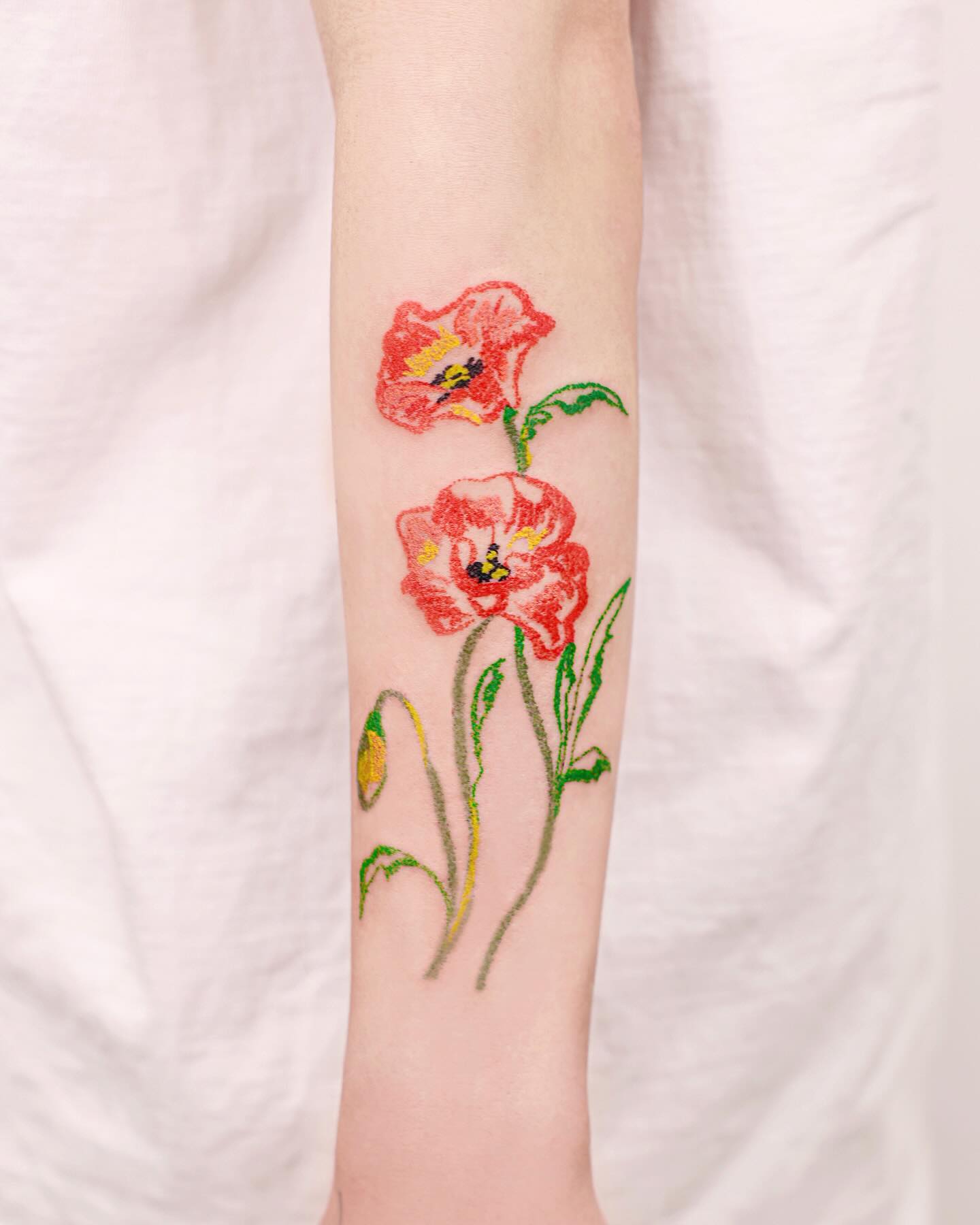 The vibrant red poppies stand out vividly against the skin, showcasing a unique watercolor style.