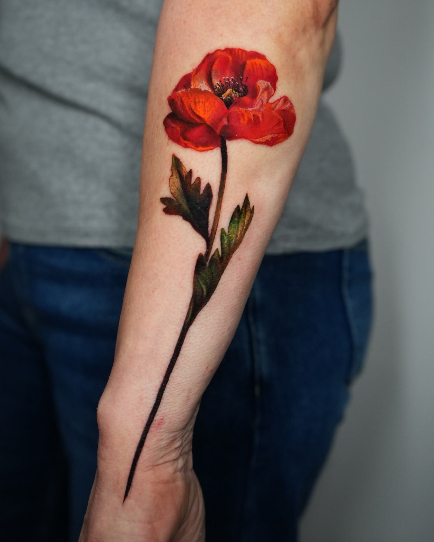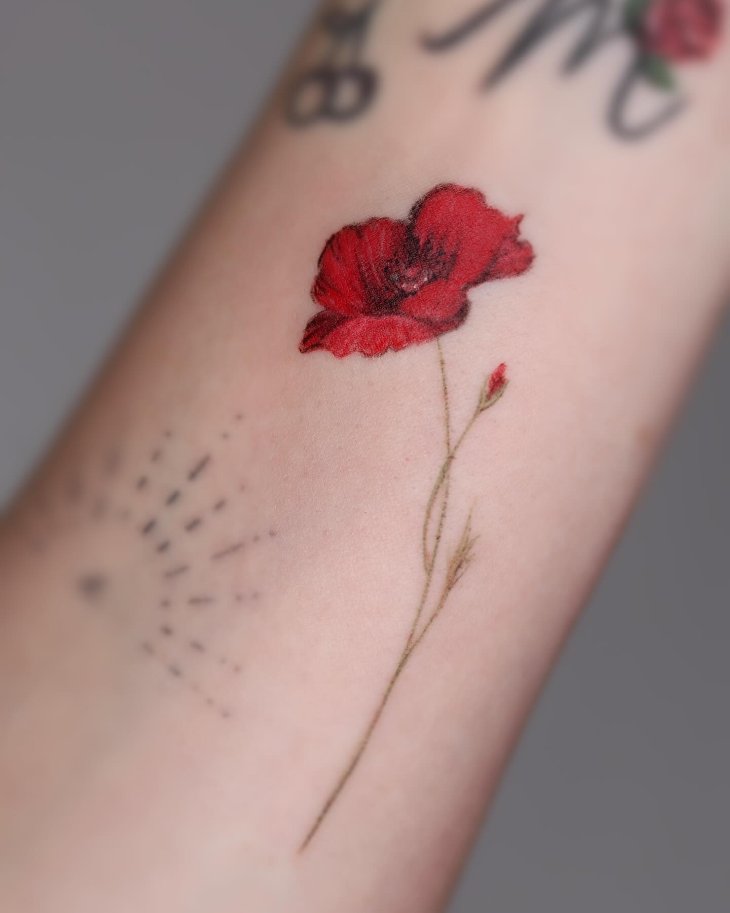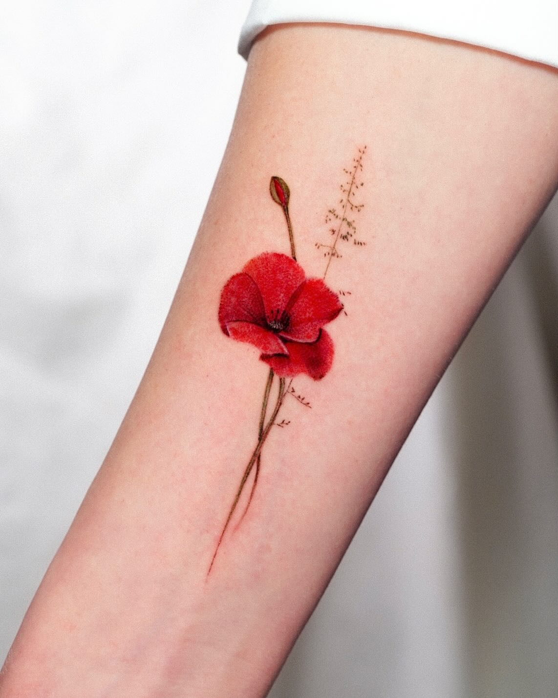 The tattoo features a striking red poppy flower alongside a delicate green bud and slender stems.