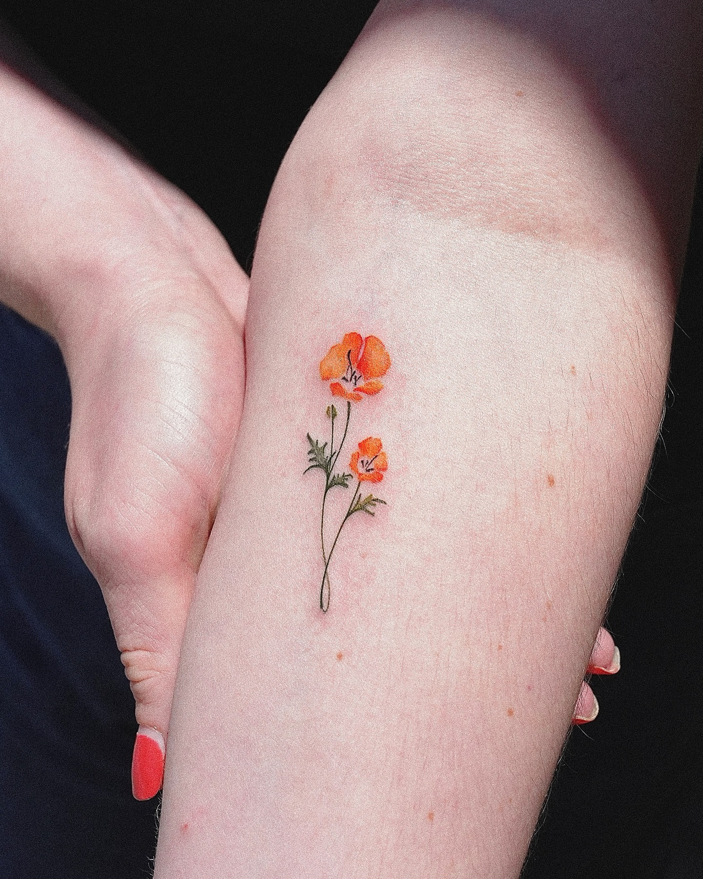 A slender stem with vibrant orange poppies stands out against the skin, showcasing a graceful design.