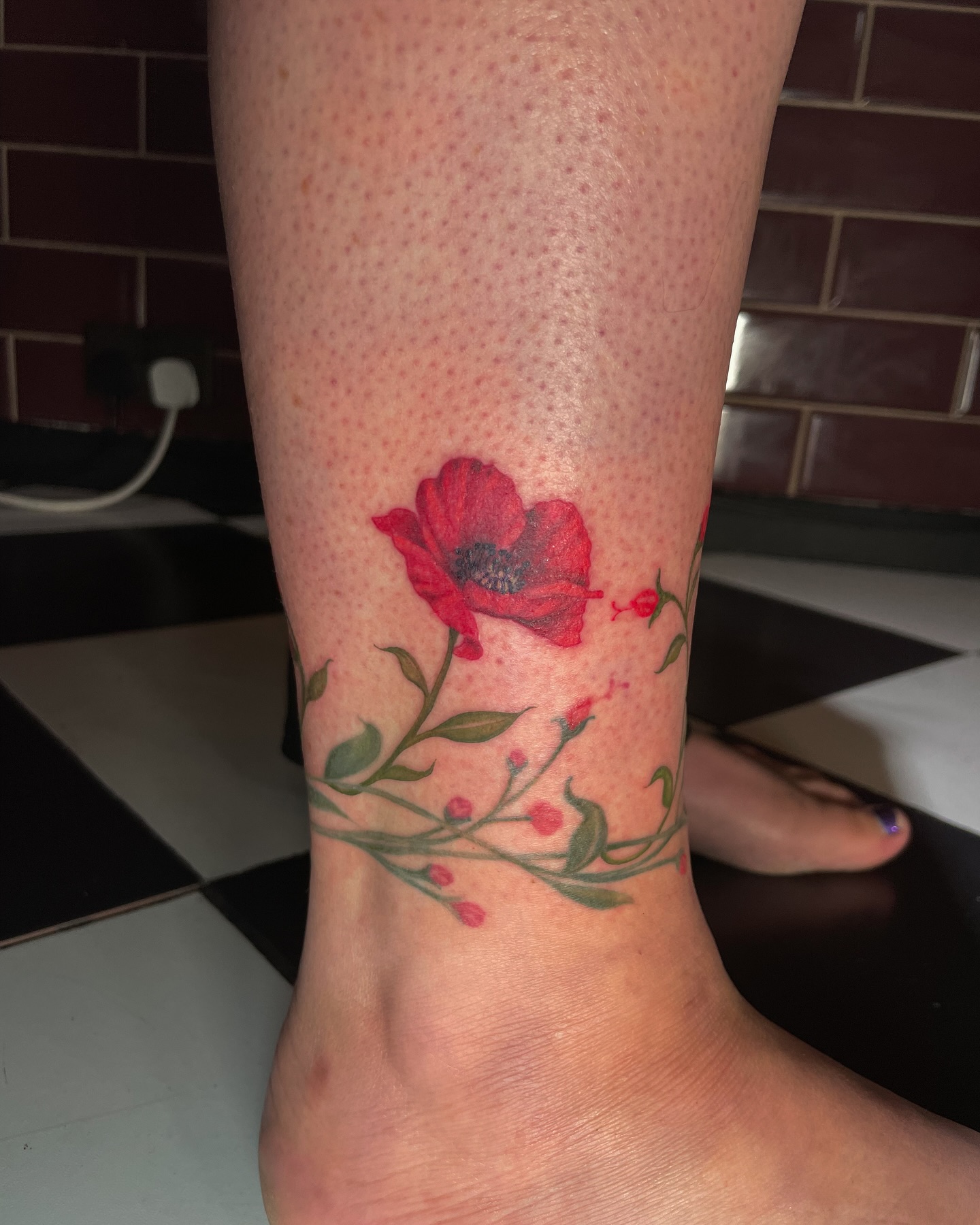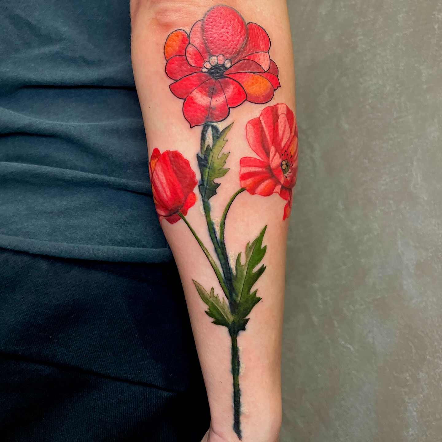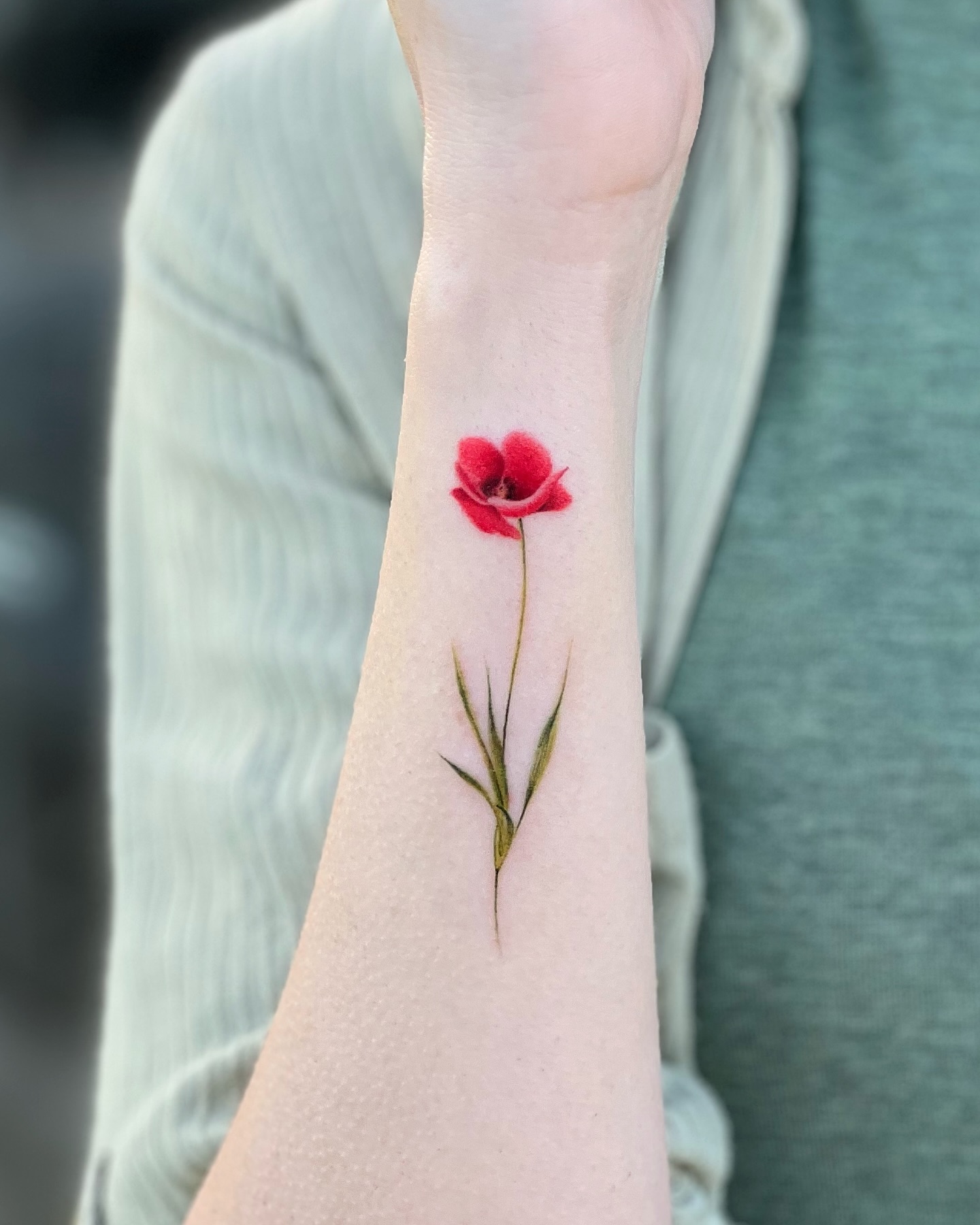 The vibrant red poppy tattoo stands out against the skin, drawing immediate attention with its bold color and intricate details.