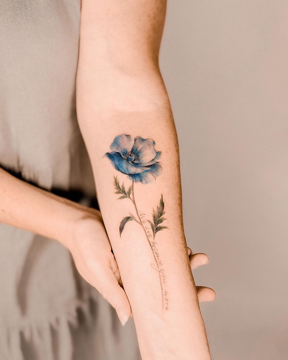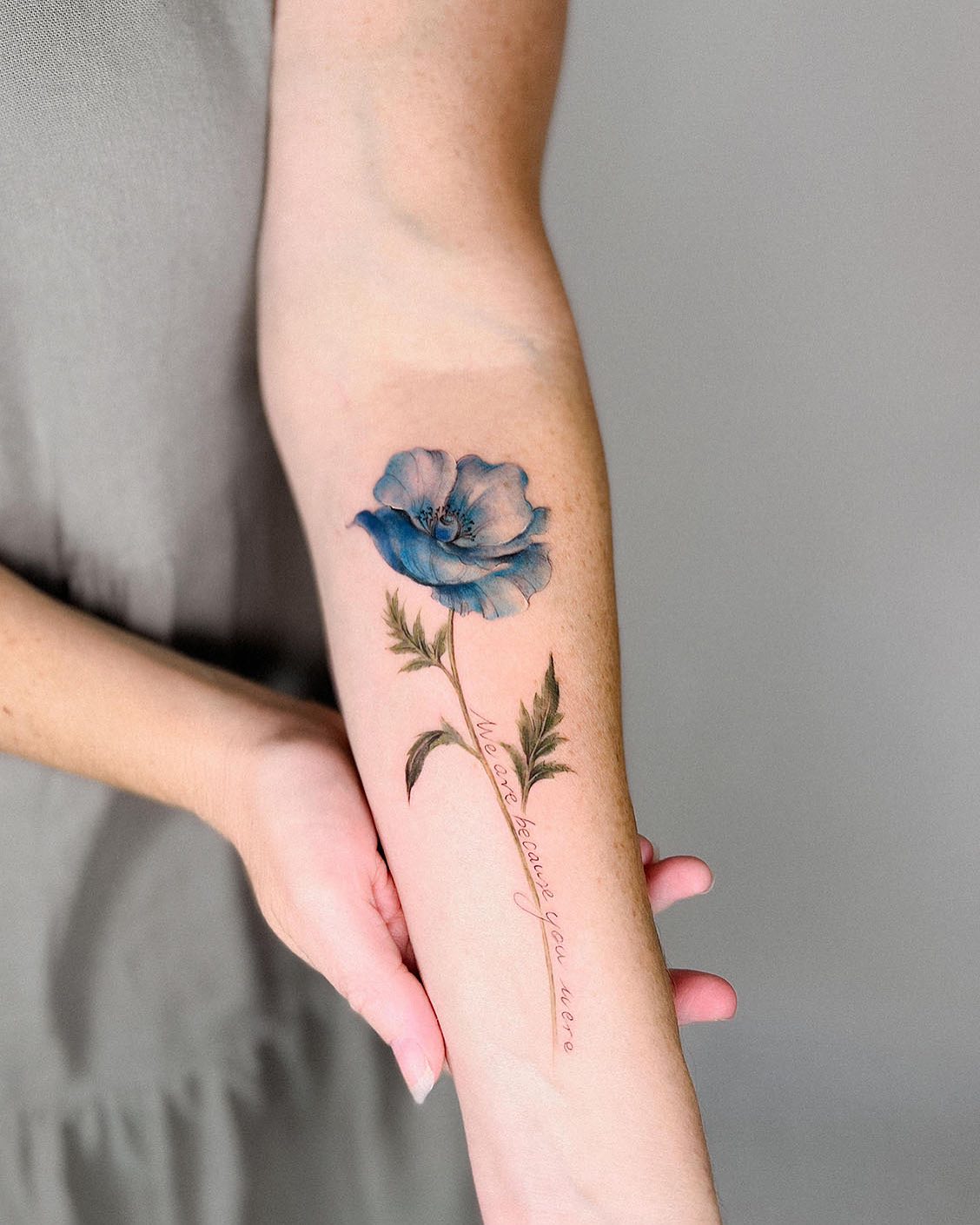 The tattoo features a delicate blue poppy with soft, flowing petals that draw attention immediately.