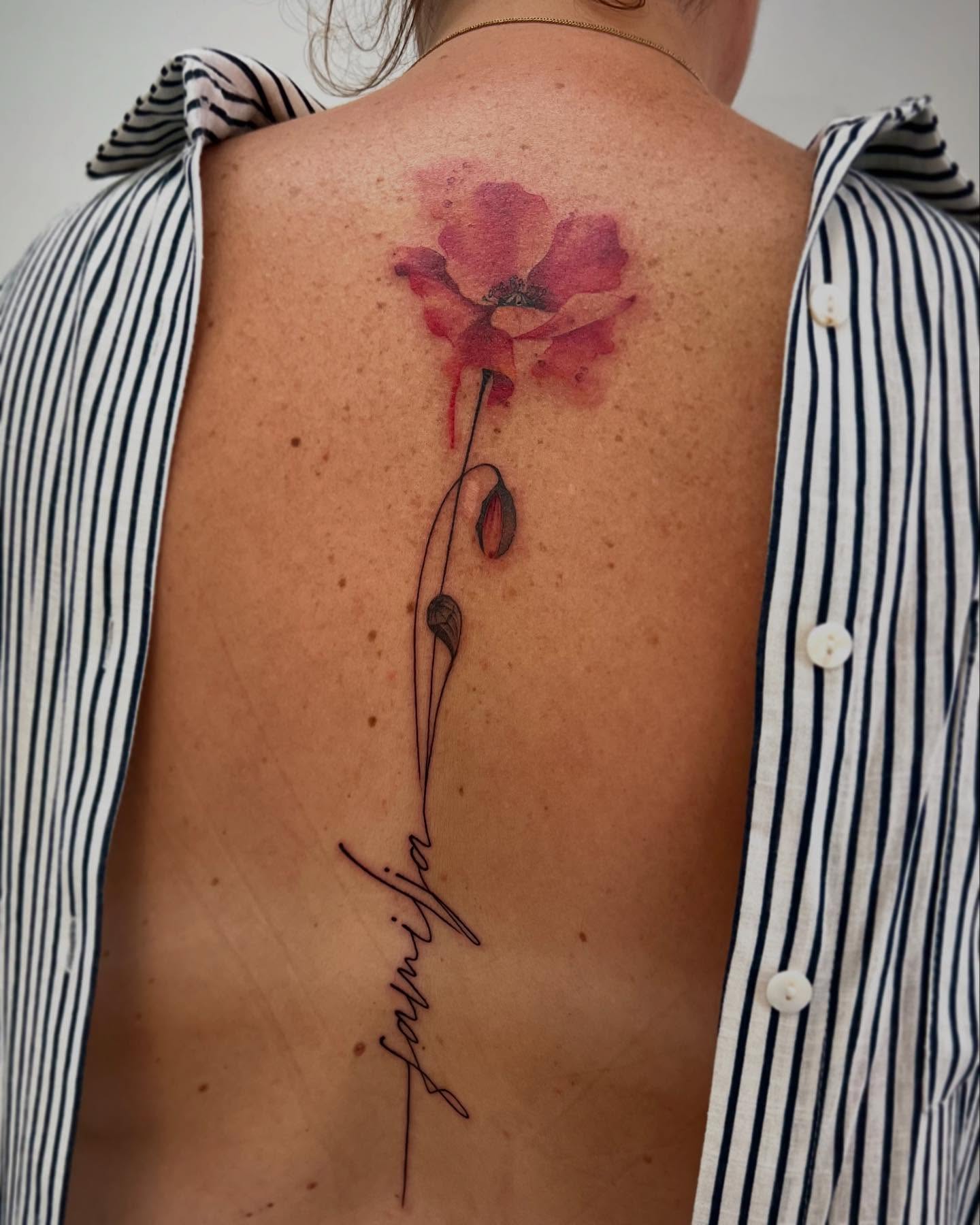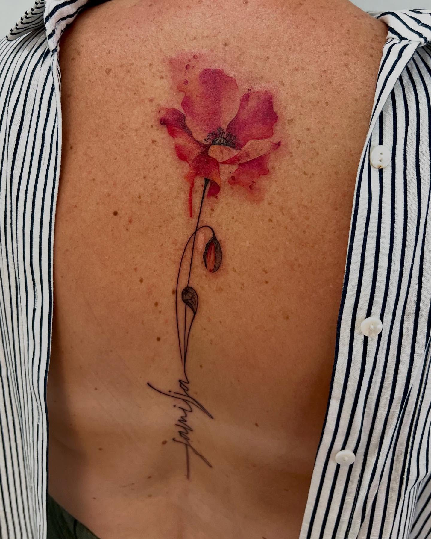 The tattoo features a vibrant watercolor poppy that blooms with shades of red and pink.
