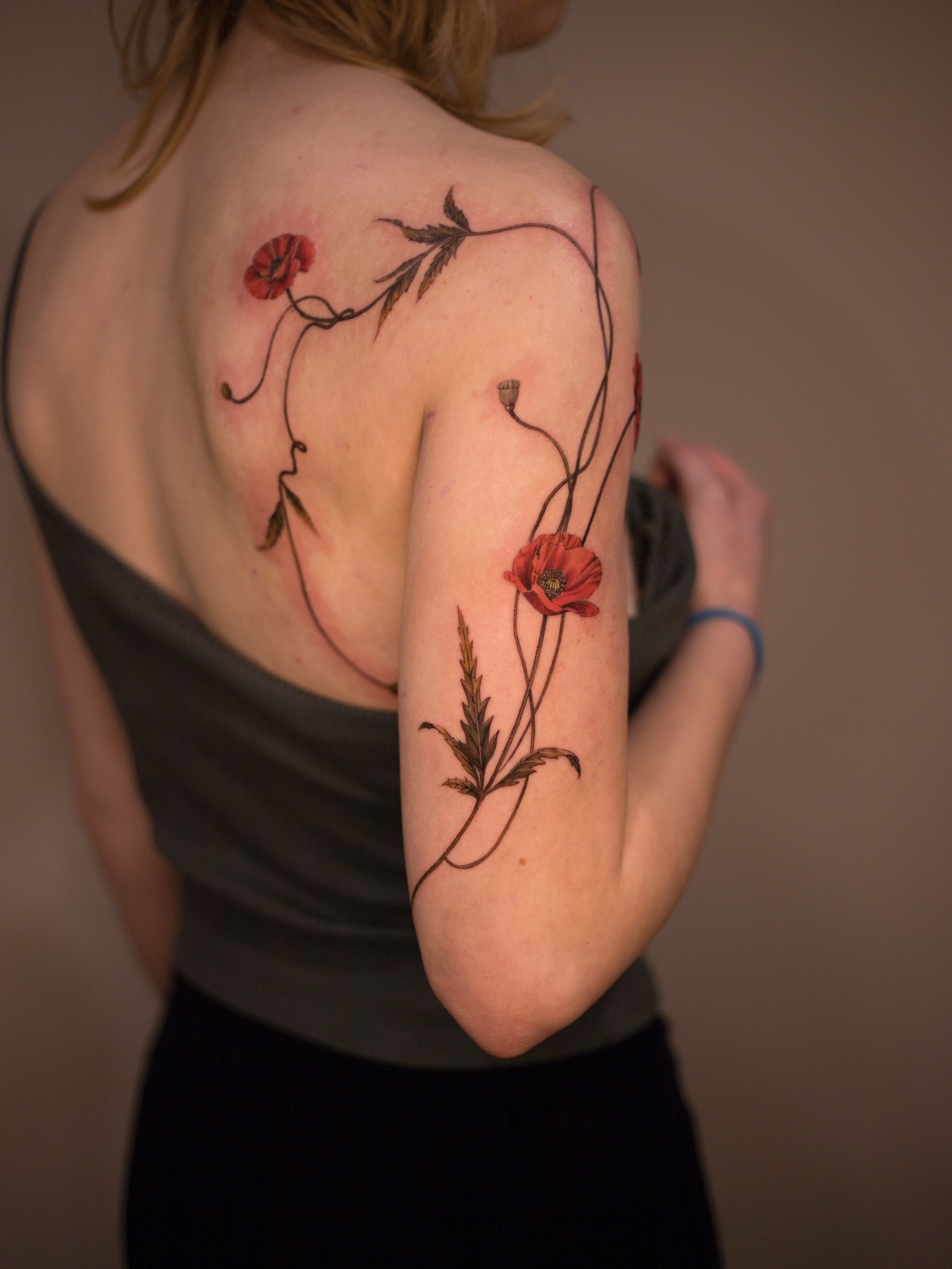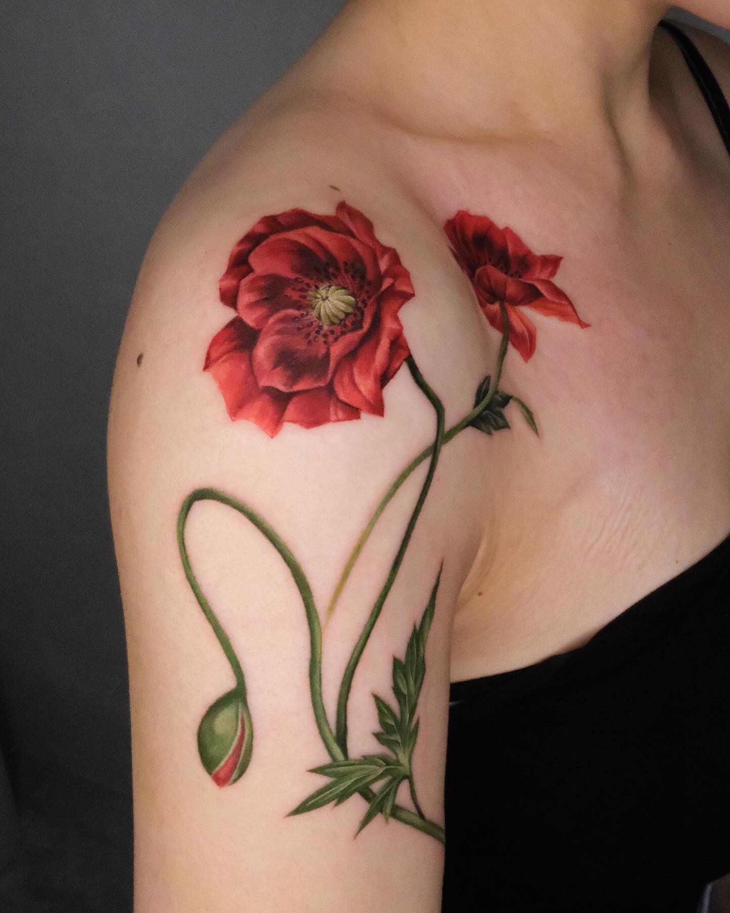 The tattoo features vibrant red poppies intertwined with delicate green leaves, gracefully wrapping around the shoulder and upper arm.